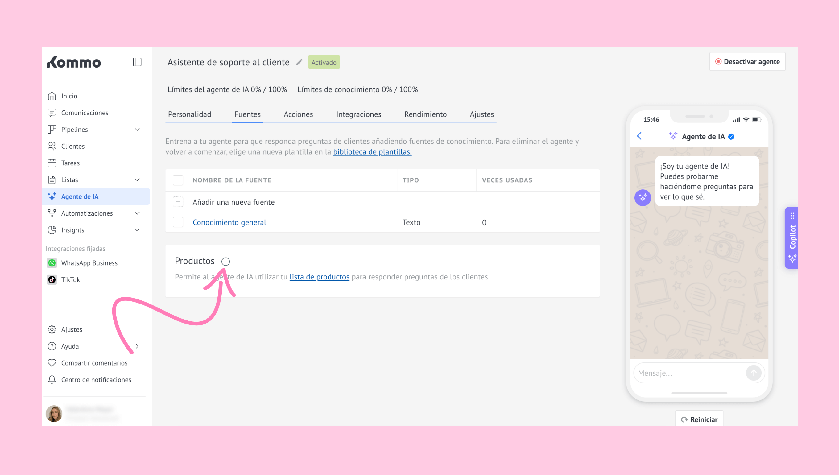 Después de añadir todas las fuentes, activa el interruptor Productos para permitir que el agente de IA acceda a la información de tu catálogo de productos.
