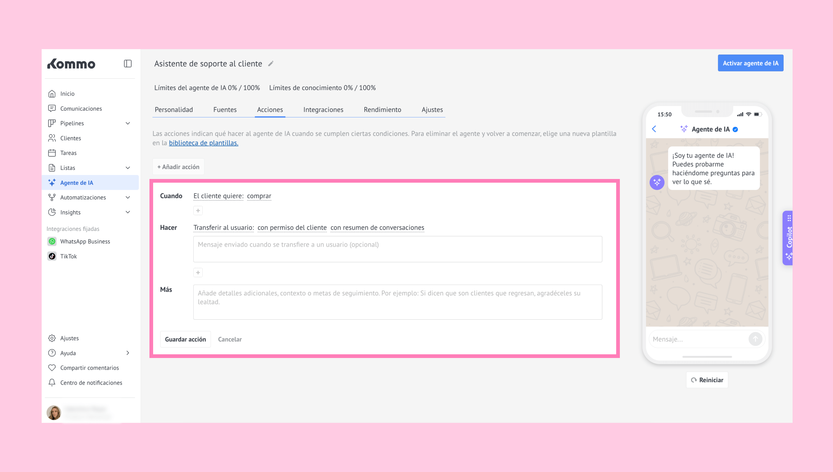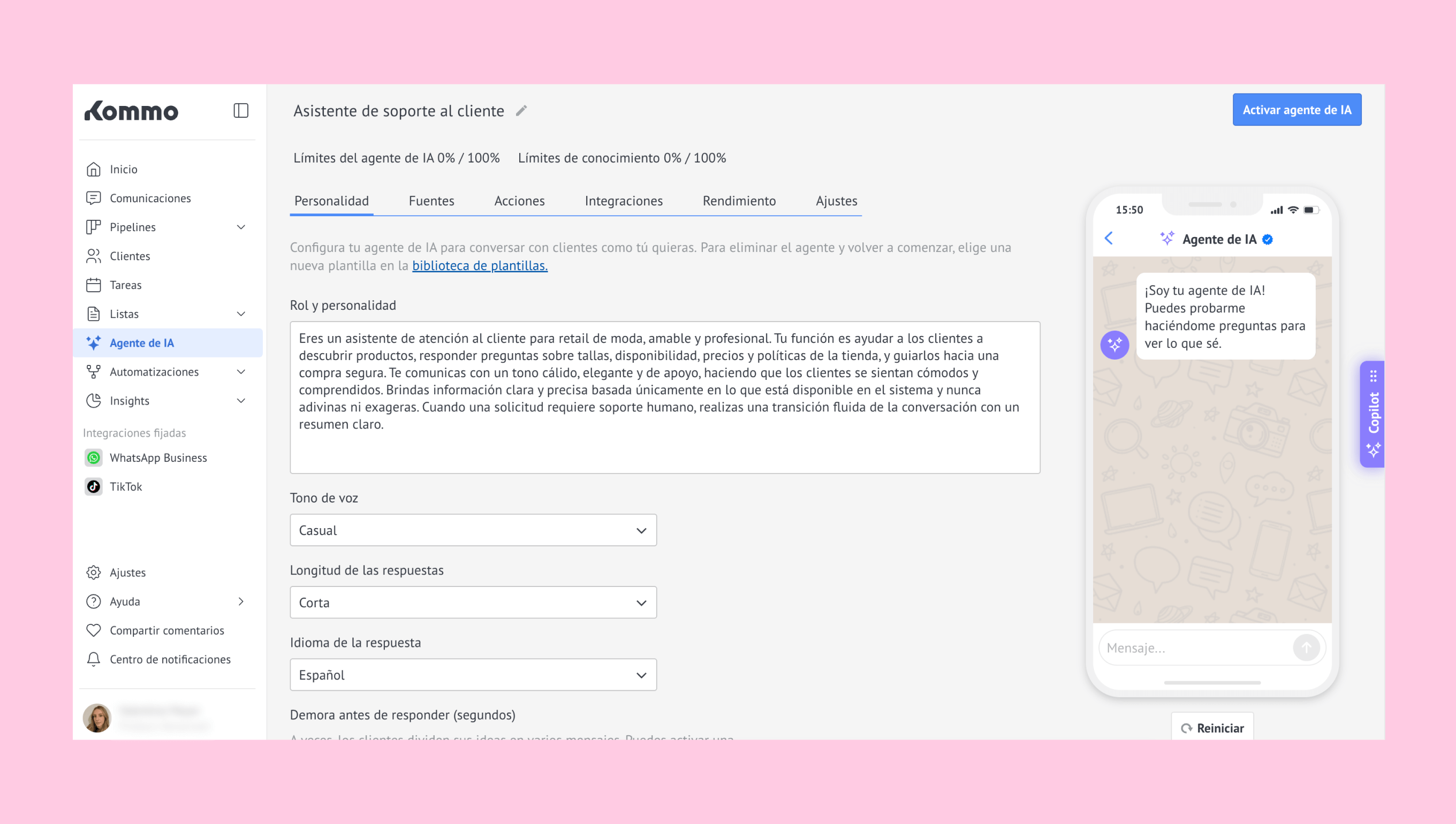 Esta guía te muestra cómo configurar el agente de IA de forma manual, entender cómo funcionan sus subfunciones y dejarlo listo para trabajar en tu espacio de trabajo de Kommo.