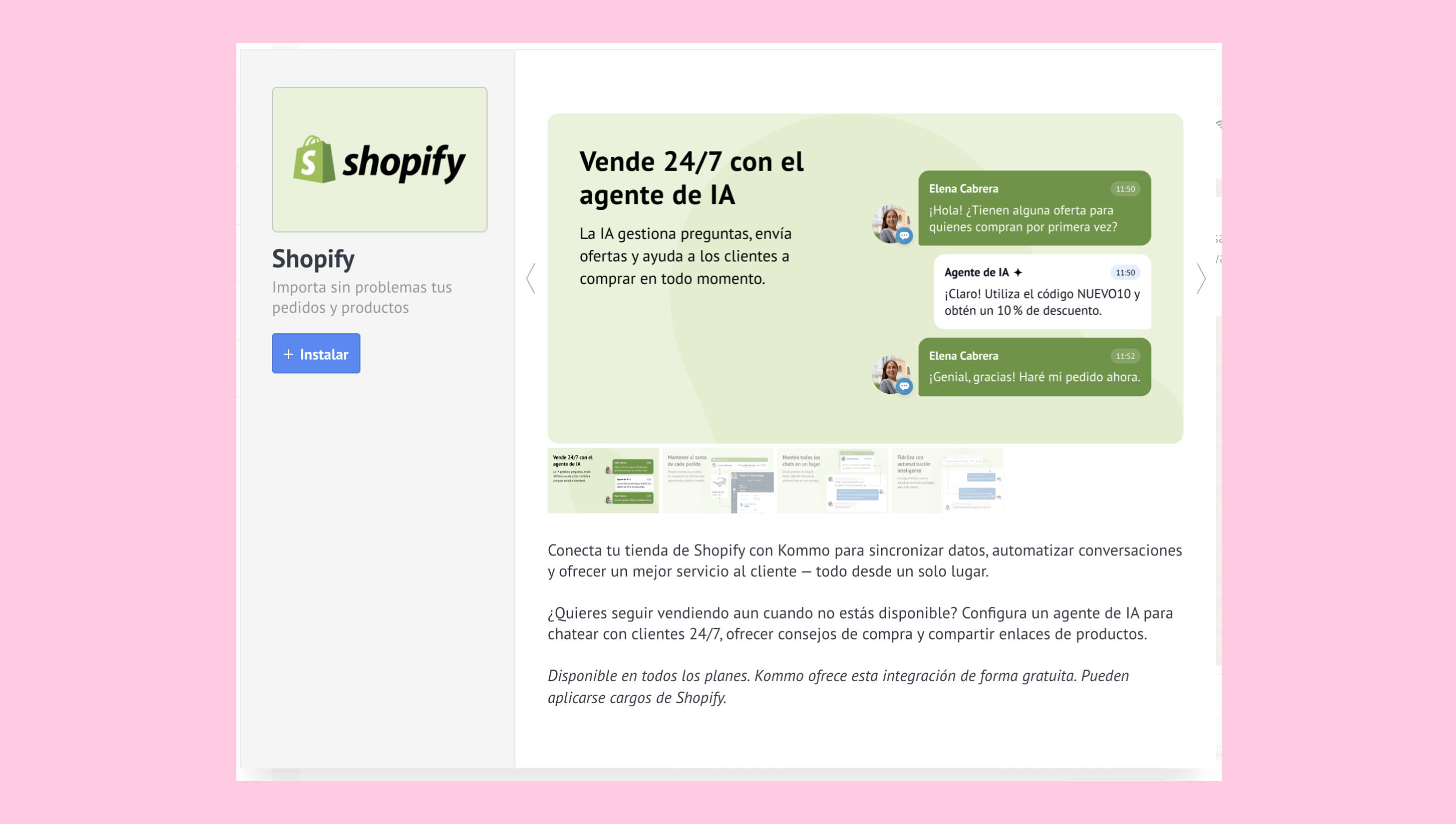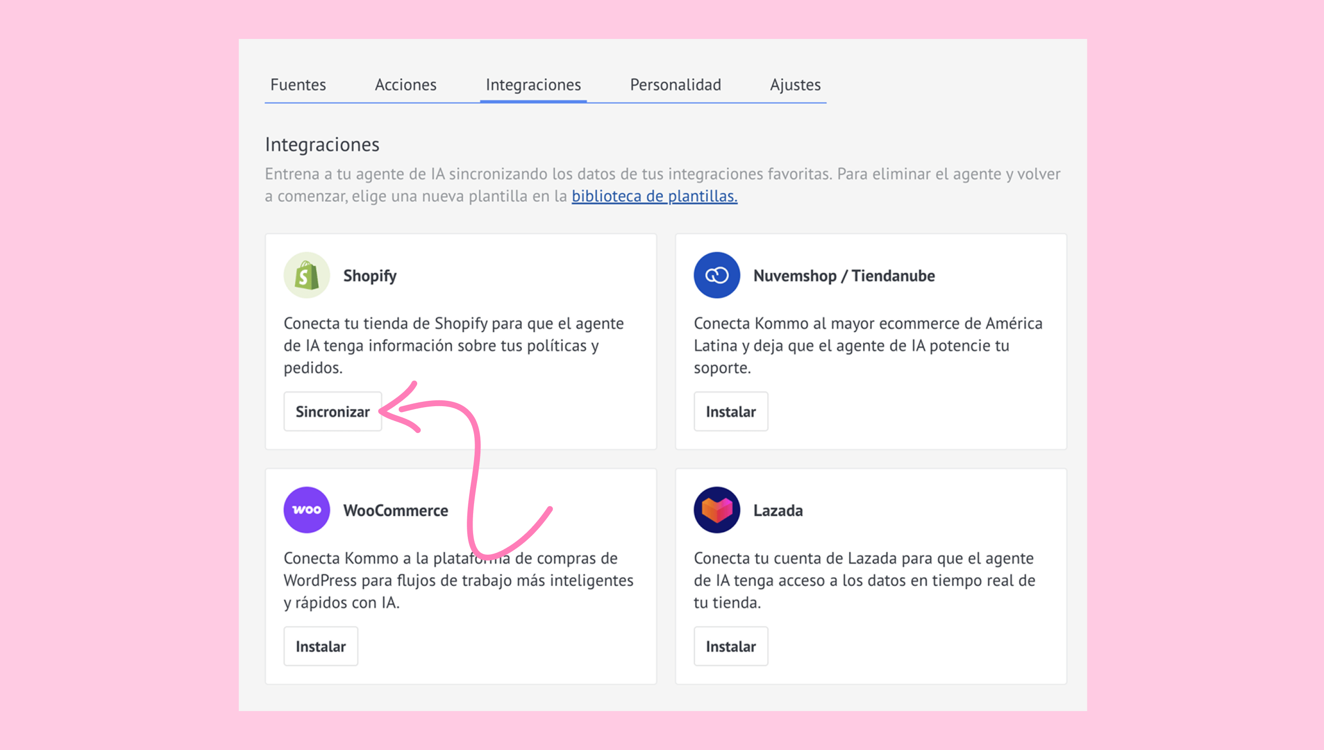 - Regresa a Kommo. El agente de IA comenzará a sincronizar toda la información de tu tienda de Shopify.