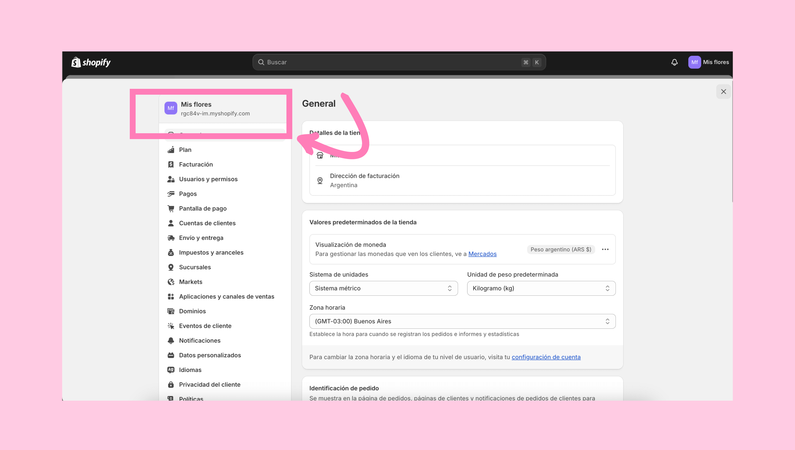 Ve a la configuración de tu tienda de Shopify. Copia el dominio que aparece debajo del nombre de tu tienda (por ejemplo, 9bb49f-c6.myshopify.com) y pégalo en la ventana modal de la integración. Luego, haz clic en Conectar para completar la integración.