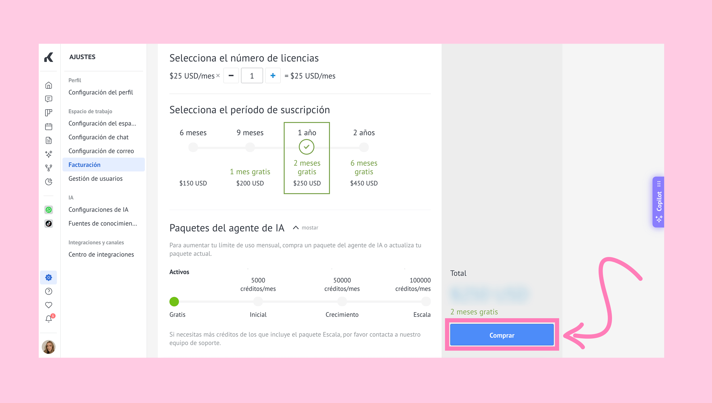 En lugar de pagar el monto total de una sola vez, puedes elegir pagar un paquete de agente de IA en cuotas.