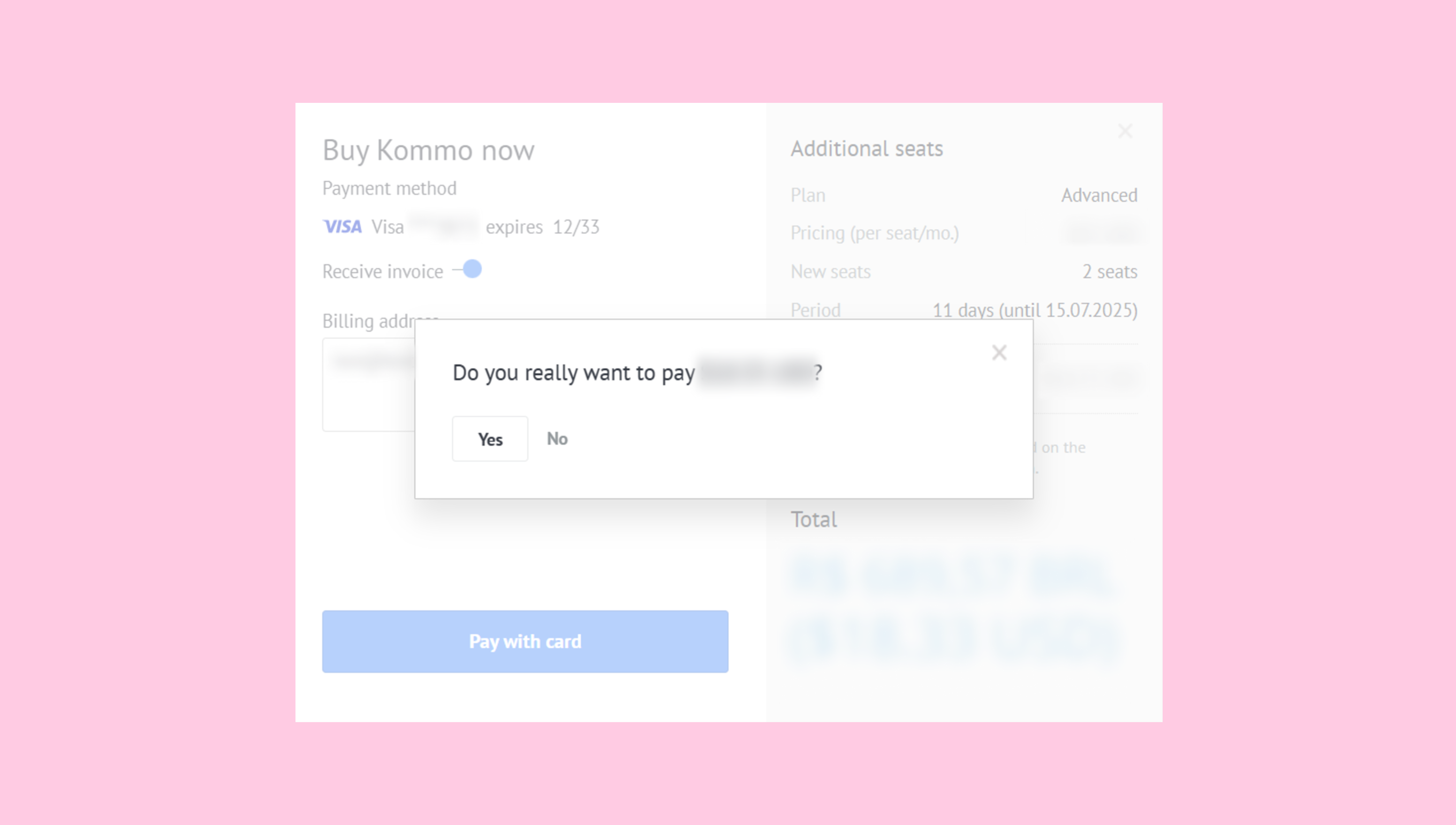- Se abre una ventana modal con el resumen del pedido. El siguiente paso depende de si los pagos recurrentes están habilitados en tu cuenta.