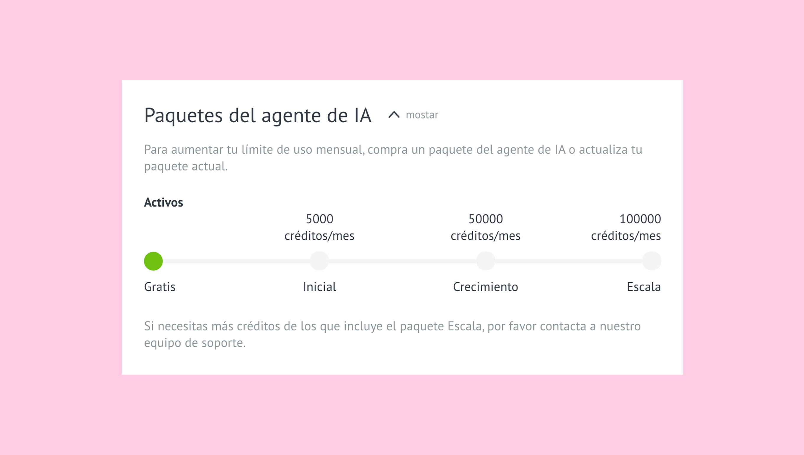 Importante: Contacta al equipo de Soporte para explorar paquetes de agente de IA personalizados con límites de créditos más altos.