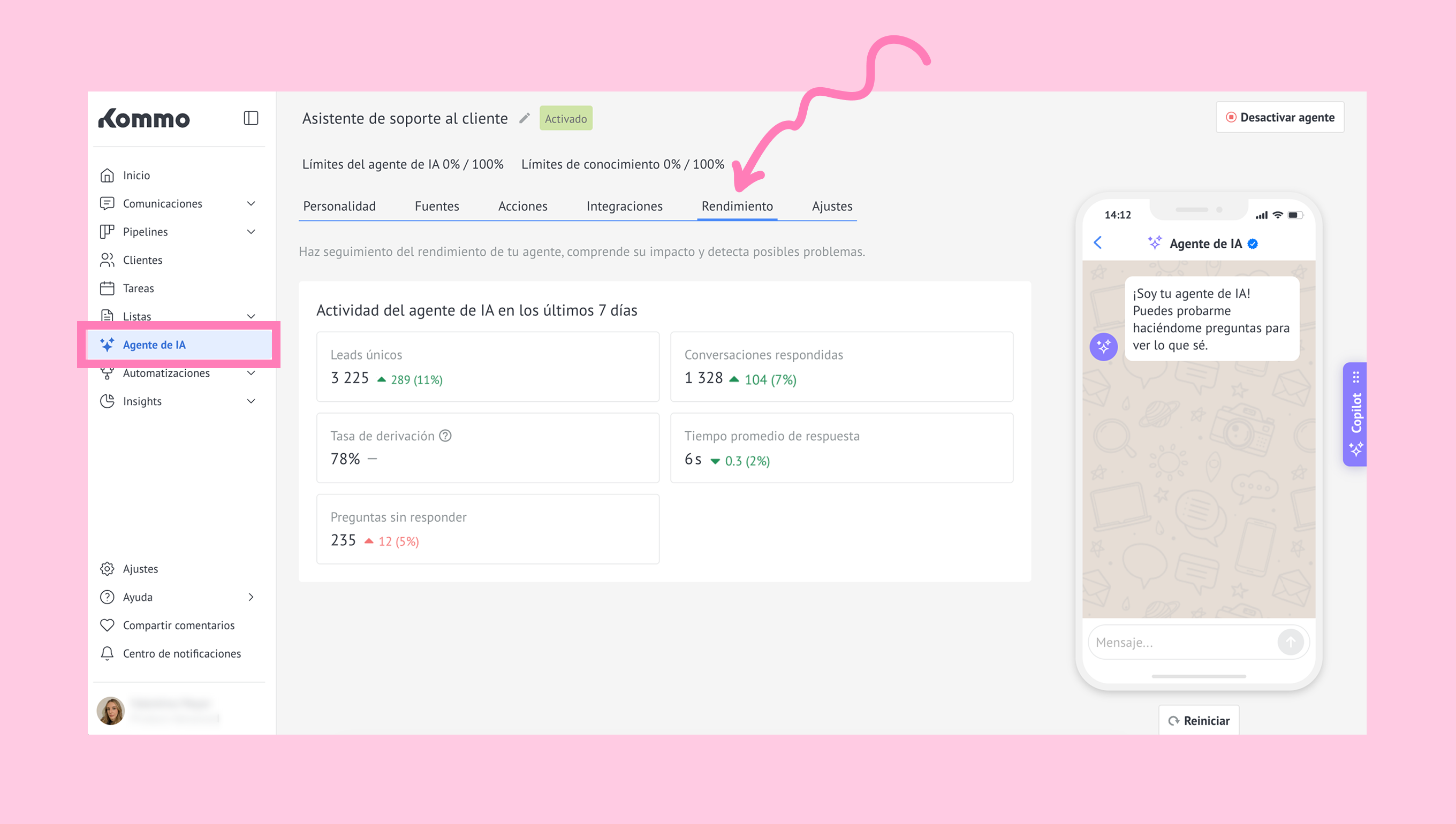 El agente de IA de Kommo responde automáticamente a los mensajes de los clientes y da soporte a los chats en curso utilizando las reglas y los datos del negocio que configuras en Kommo.
