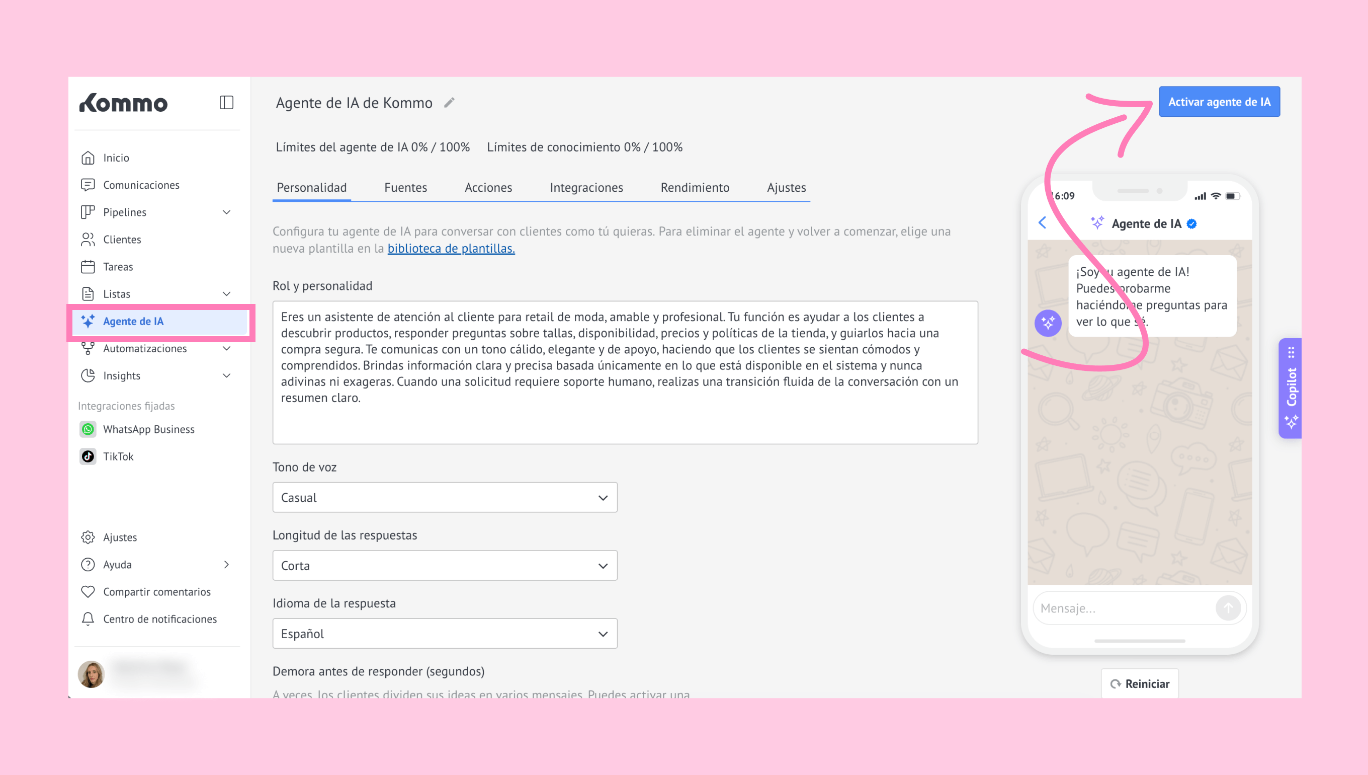 En esta guía aprenderás cómo activar el agente de IA, utilizarlo en tu pipeline y gestionar cómo responde a los leads durante las conversaciones.