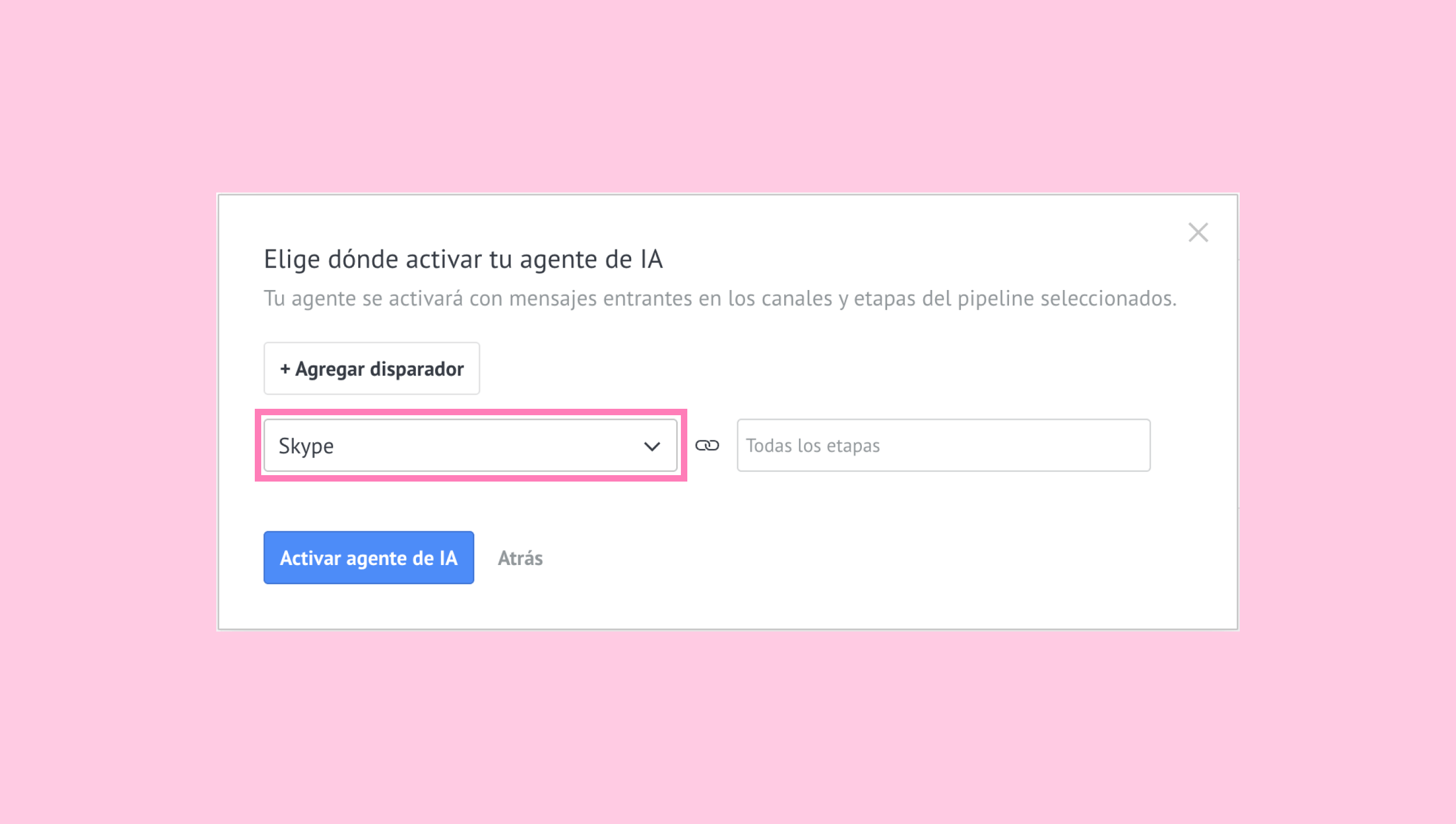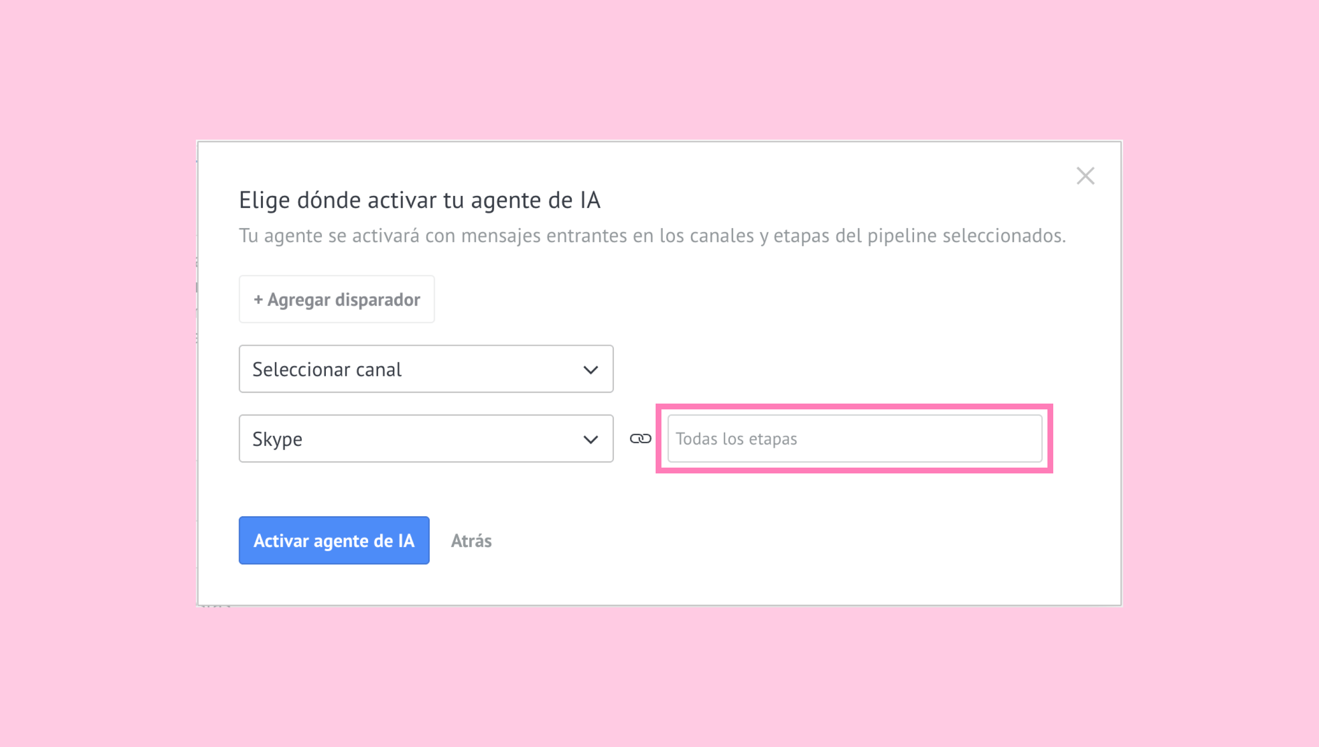 Nota: Si el pipeline tiene varios disparadores o canales por etapa, la configuración reflejará todas las etapas y canales correspondientes. El agente de IA no se activará si no se selecciona ninguna etapa.