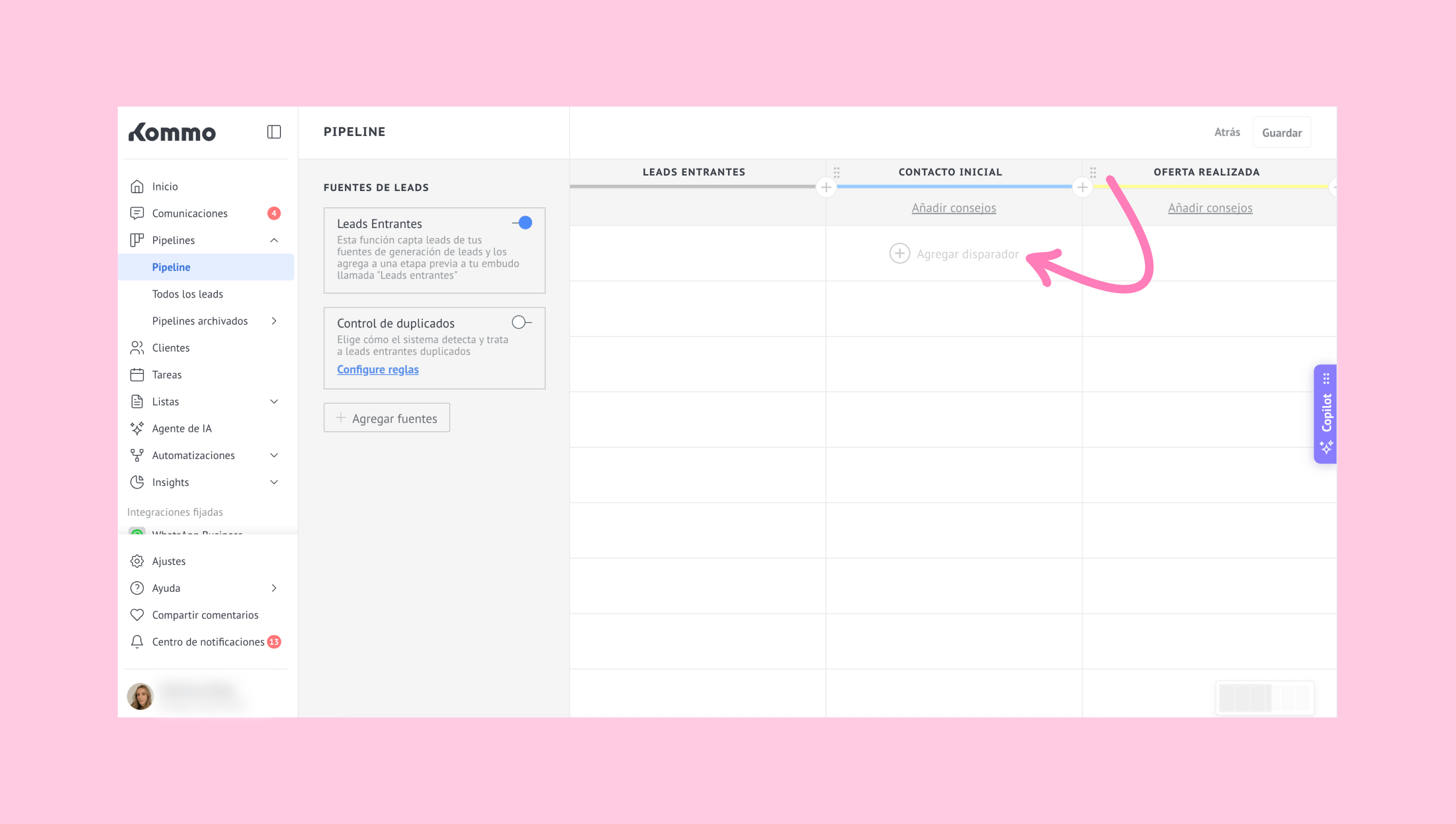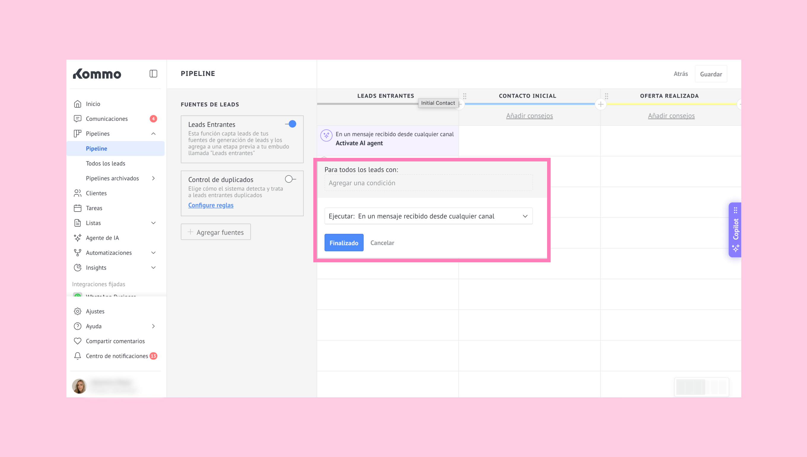 Nota: El agente de IA se activa solo en las etapas que tienen un disparador, pero sigue respondiendo incluso si la conversación se mueve a etapas sin disparadores configurados. Si un lead entra en una etapa sin un disparador de IA, el agente no iniciará nuevas conversaciones en esa etapa.