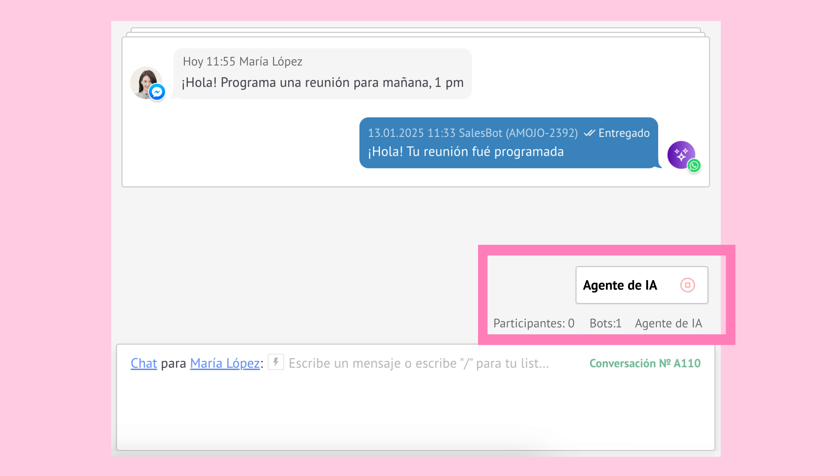 - Abre la conversación activa y busca el agente de IA que aparece sobre el cuadro de chat, junto a las personas participantes.