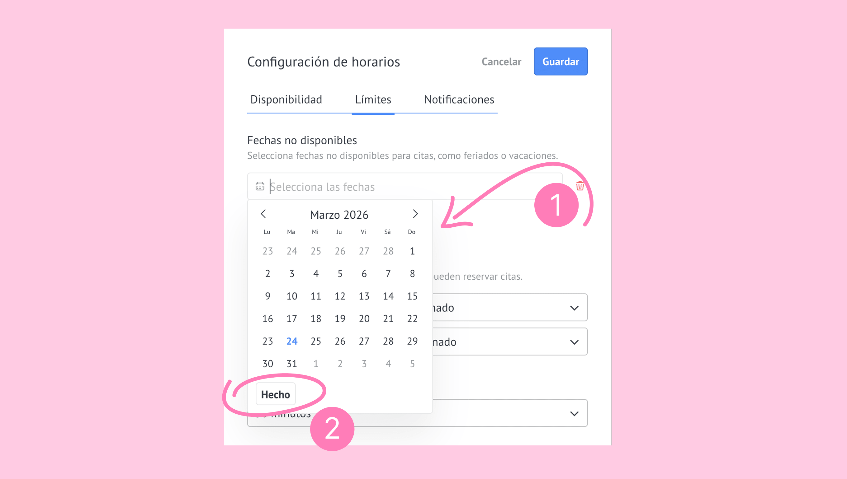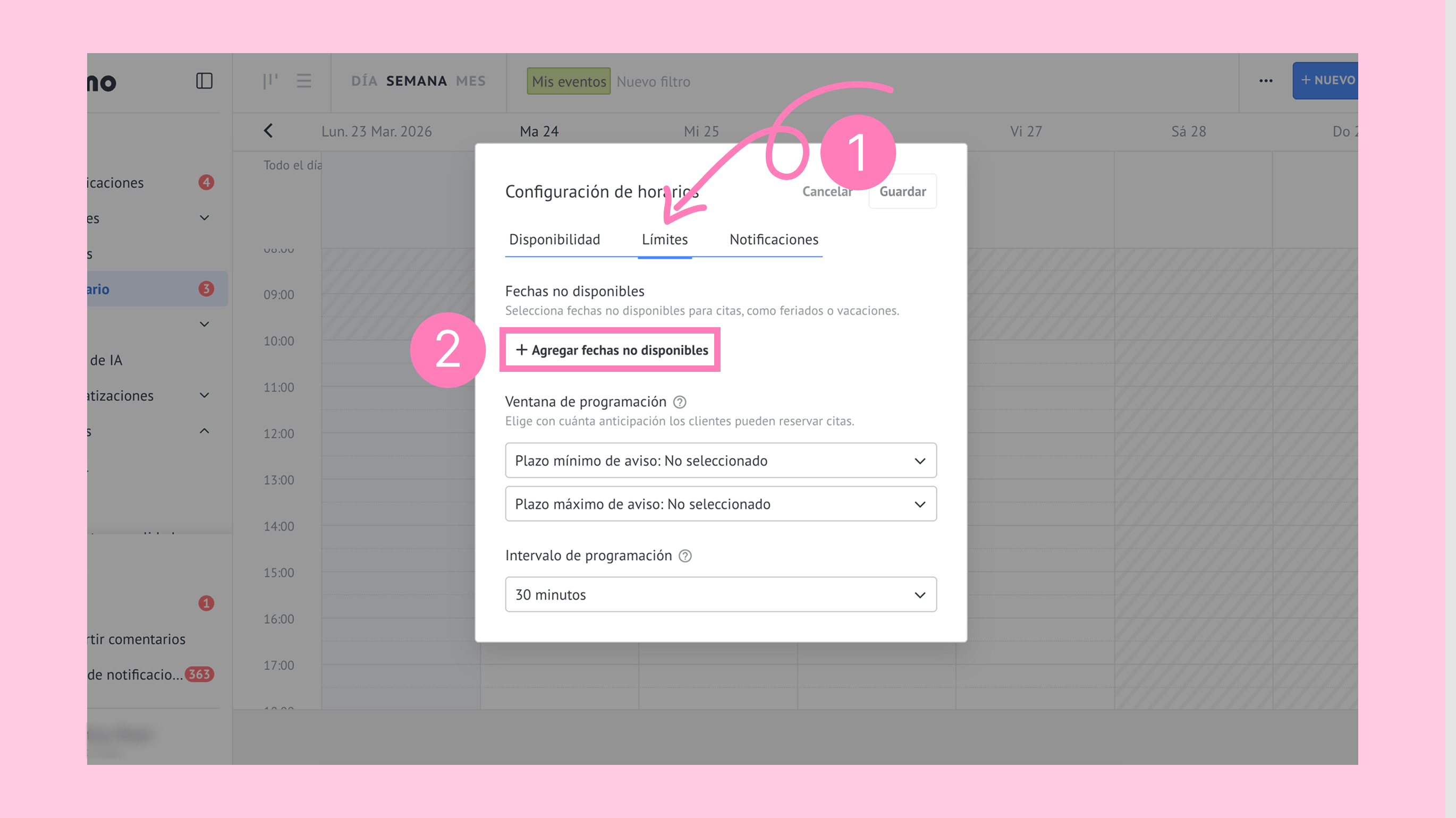 Los límites del horario establecen reglas que restringen la programación de citas en determinados periodos. Aquí puedes configurar: