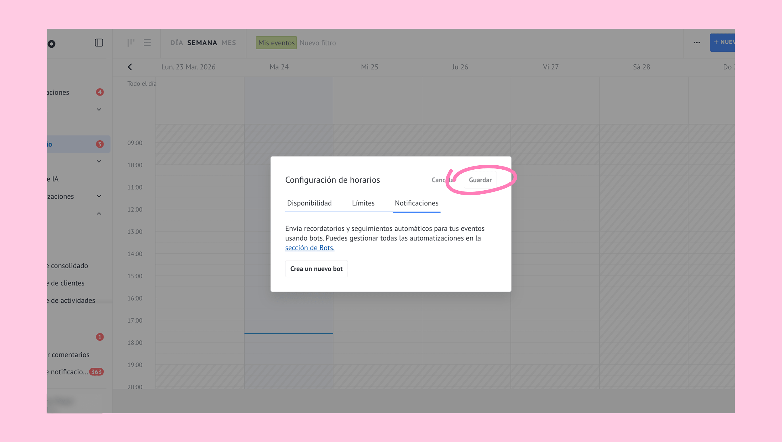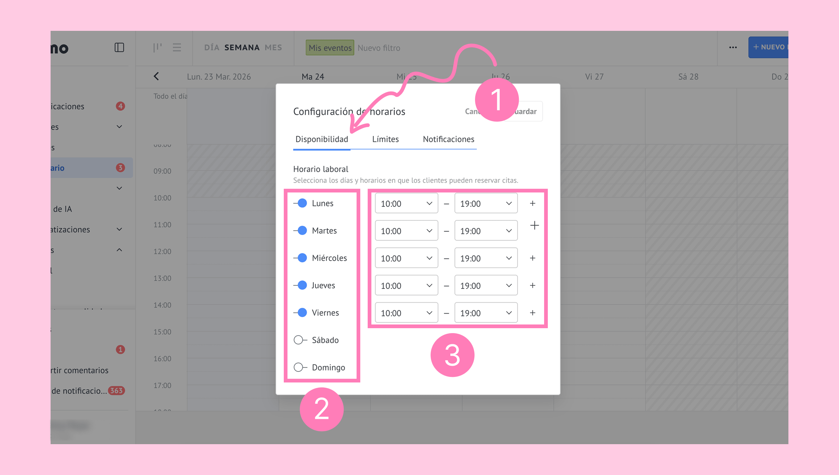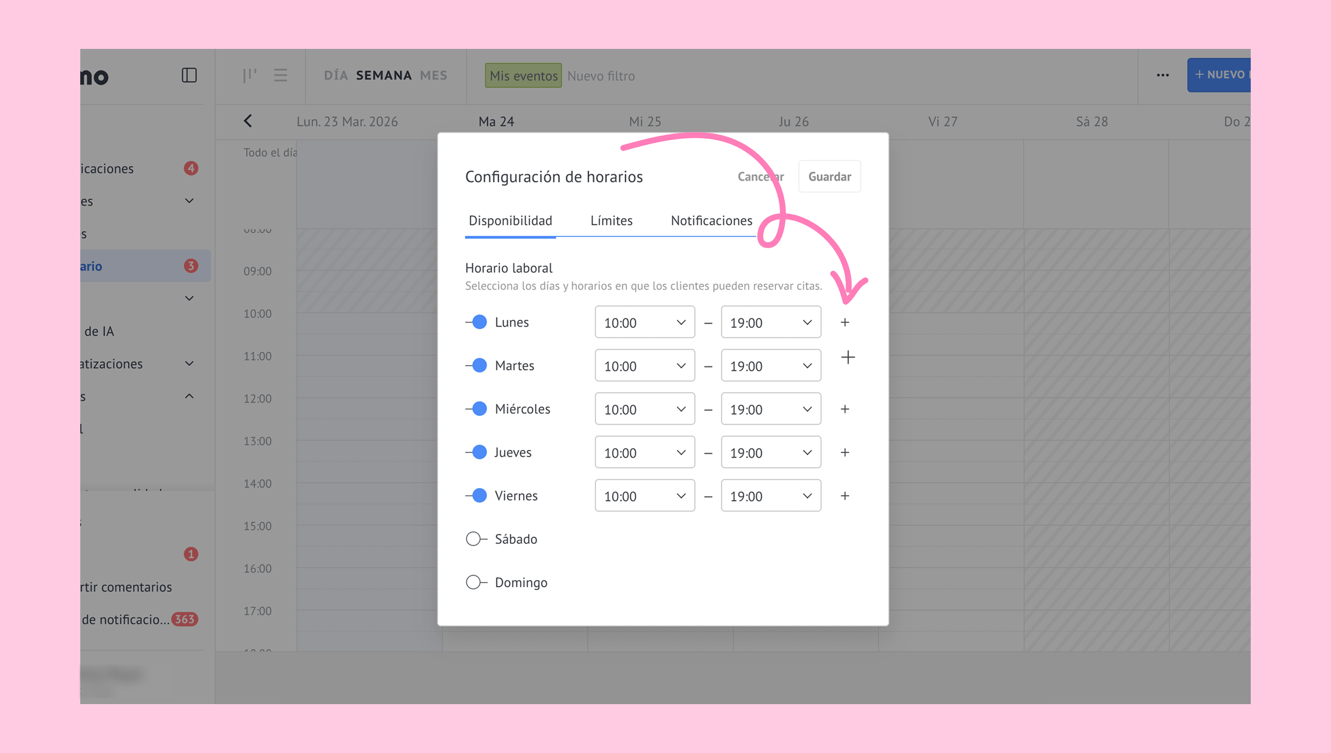 Se abrirá una nueva ventana donde podrás configurar la disponibilidad, los límites y las notificaciones.