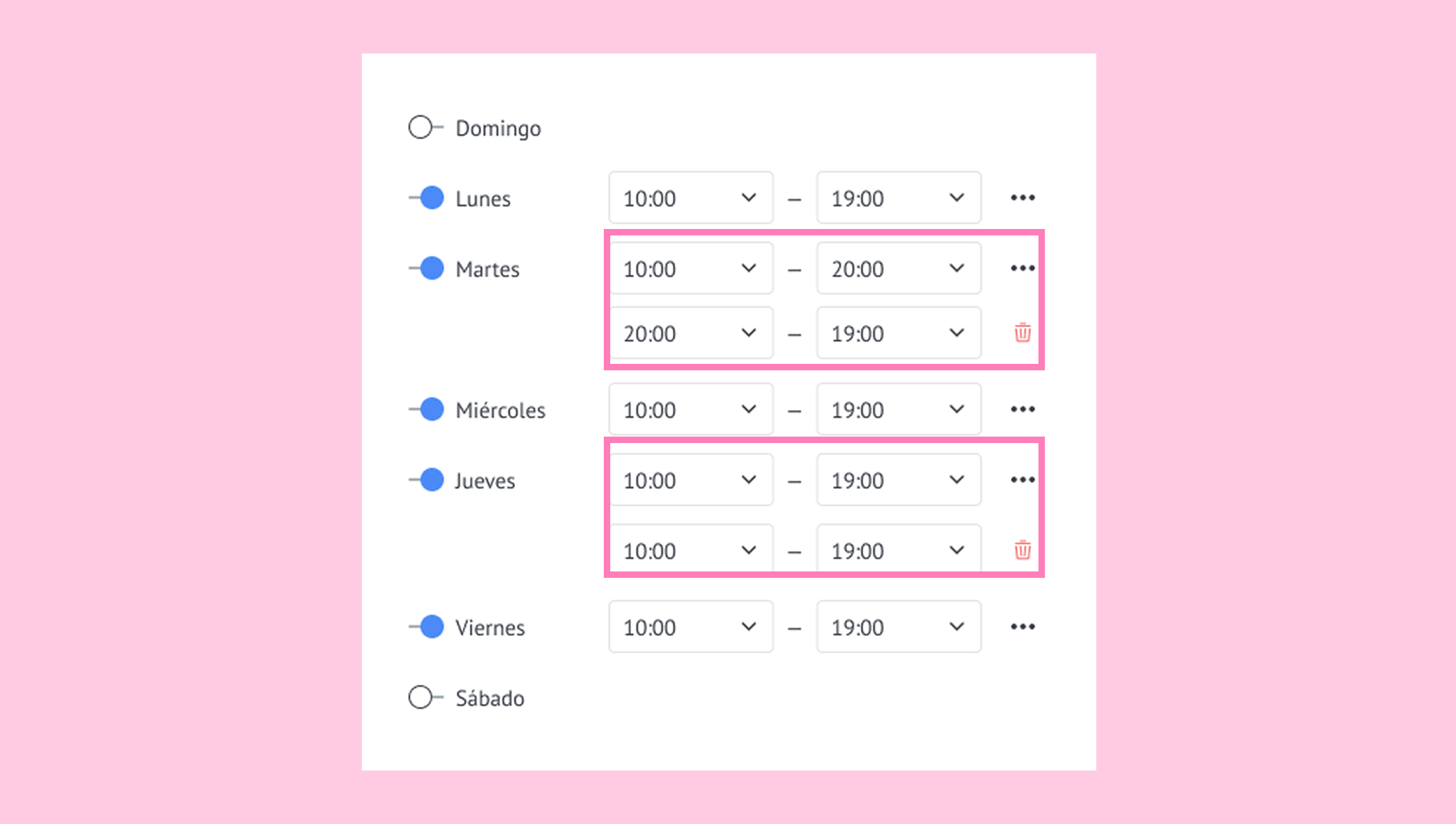 Esto puede hacerse para cada día de la semana. Por ejemplo: martes: 10:00–15:00, 17:00–19:00; viernes: 12:00–14:00, 18:00–22:00.