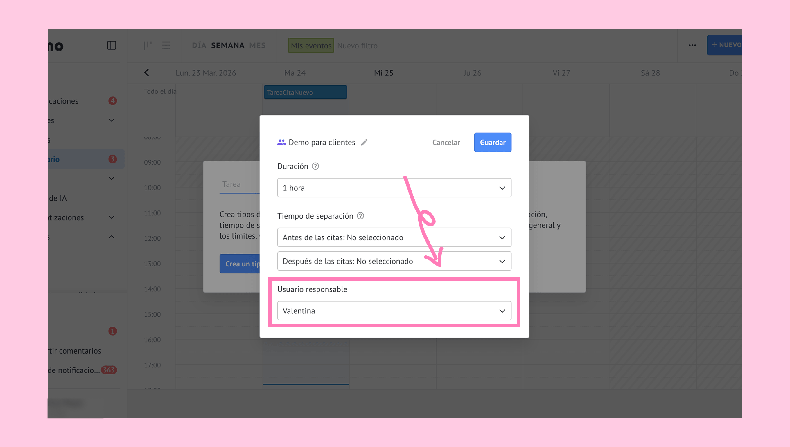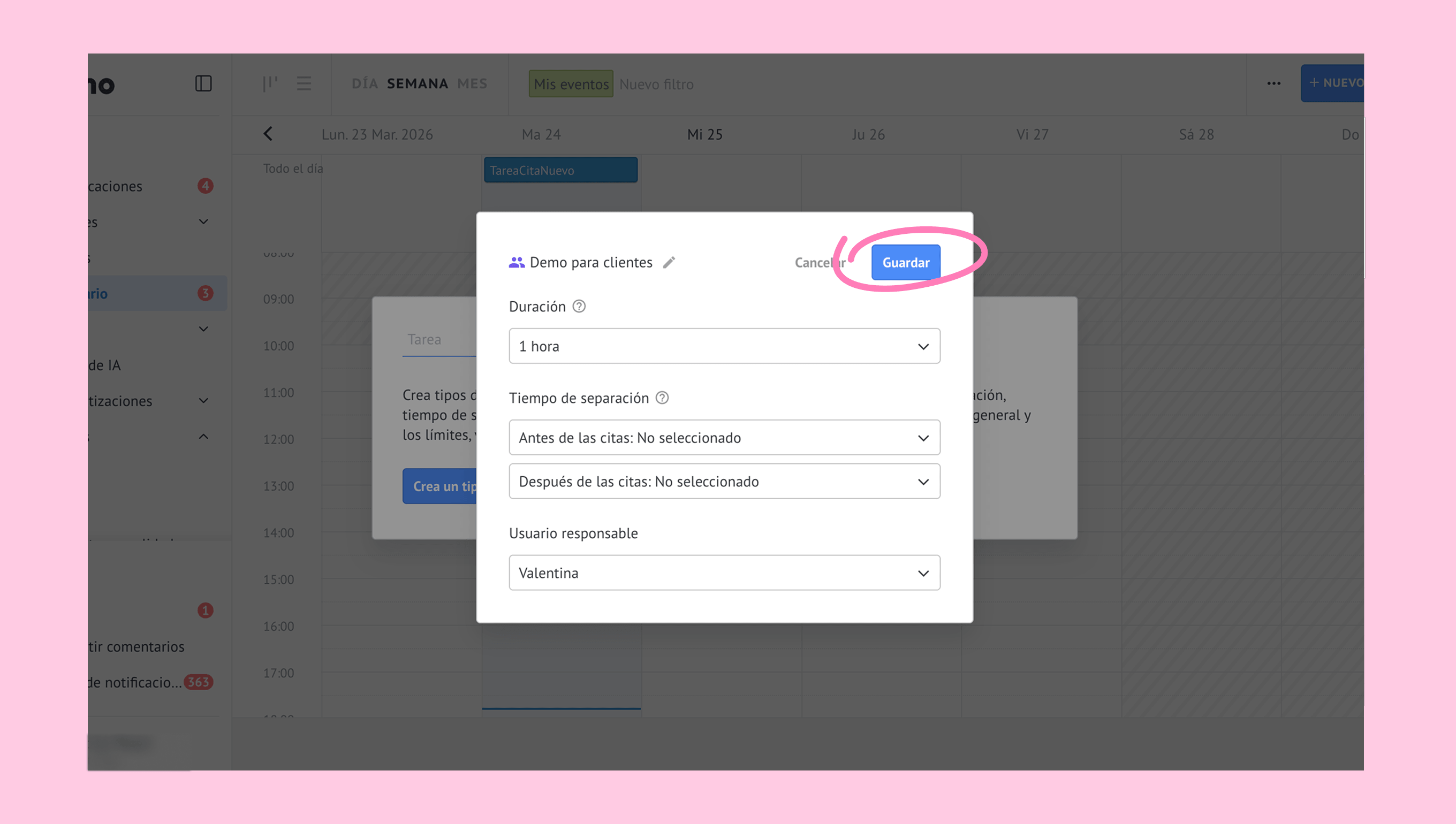 Puedes crear tipos de cita con su propia duración, usuario responsable y tiempo de margen entre citas.