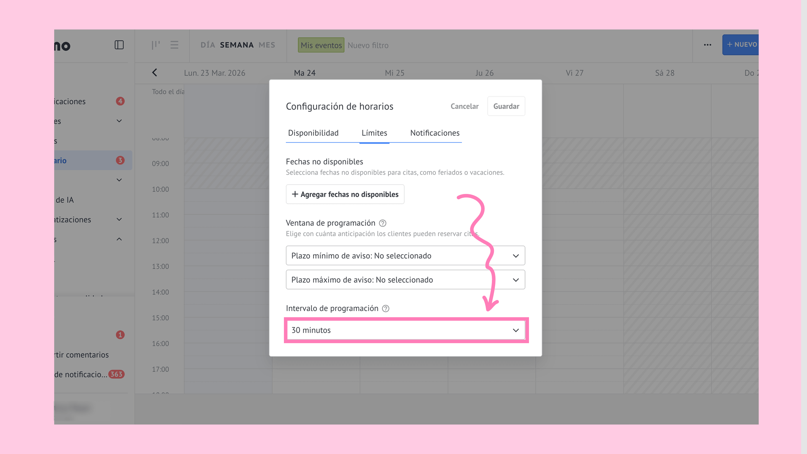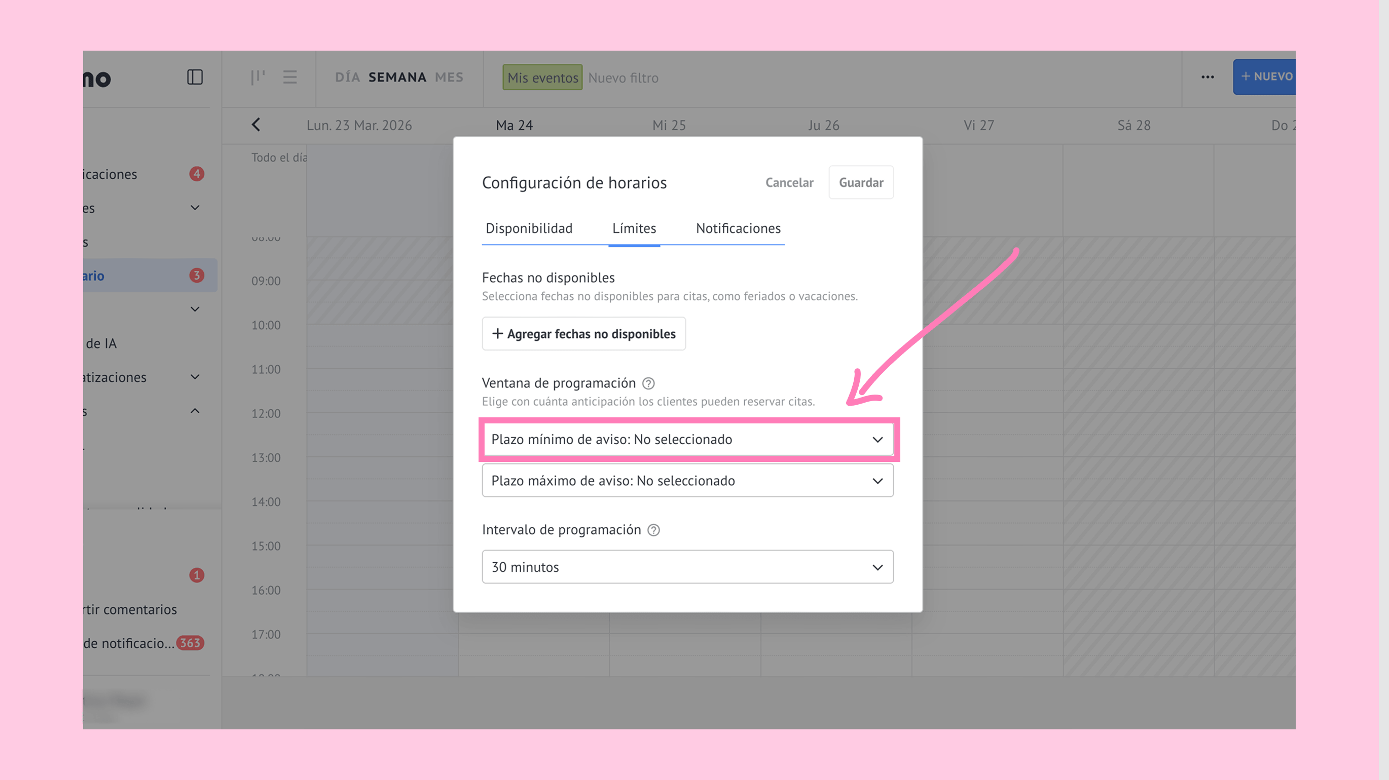 Haz clic en Plazo mínimo de aviso. → Selecciona una opción (1 día, 3 días, 1 semana o 1 mes). El plazo mínimo de aviso es el tiempo mínimo requerido antes de que se pueda reservar una cita. Los clientes solo pueden seleccionar las fechas después de este periodo. Por ejemplo, con un plazo mínimo de aviso de 1 día, si un cliente reserva el 1 de marzo, la cita más cercana disponible será el 2 de marzo.