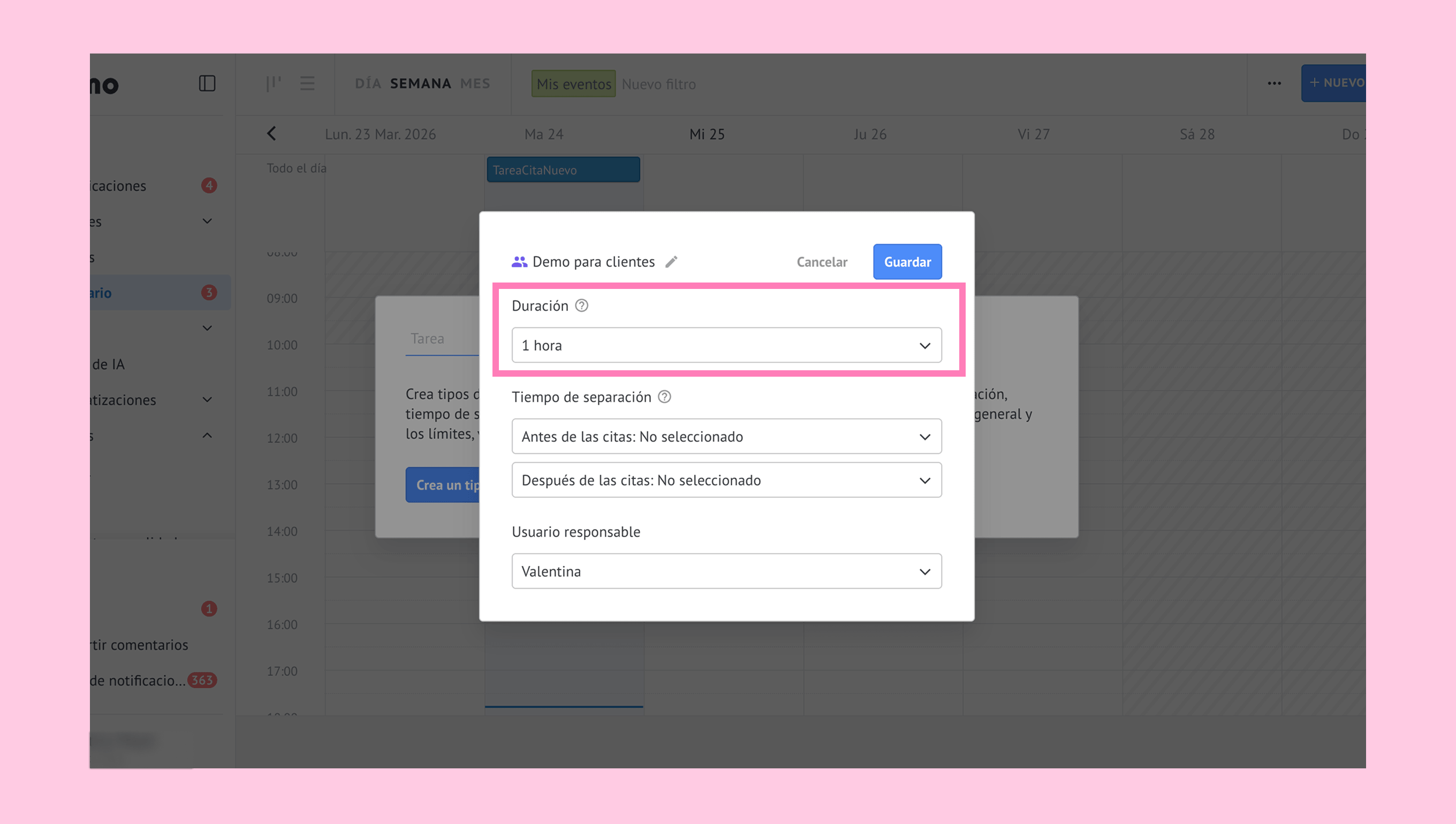 Define la duración de la cita. Para hacerlo, haz clic en el menú desplegable Duración. Selecciona una de las opciones (15 min, 30 min, 1 hora, 2 horas).