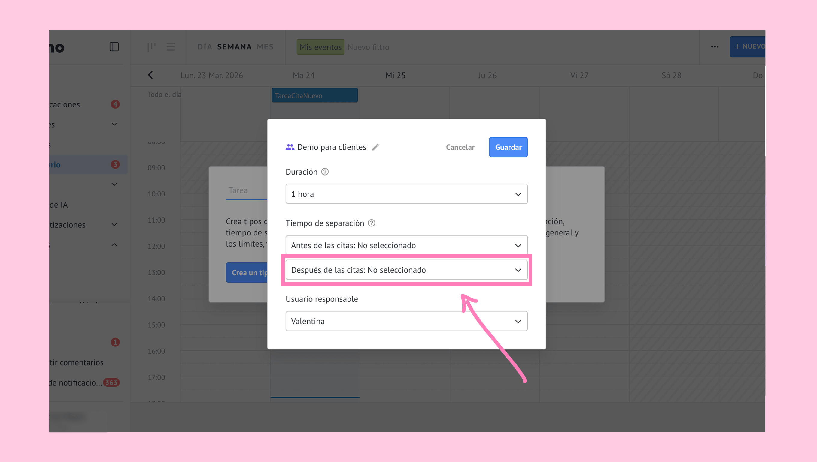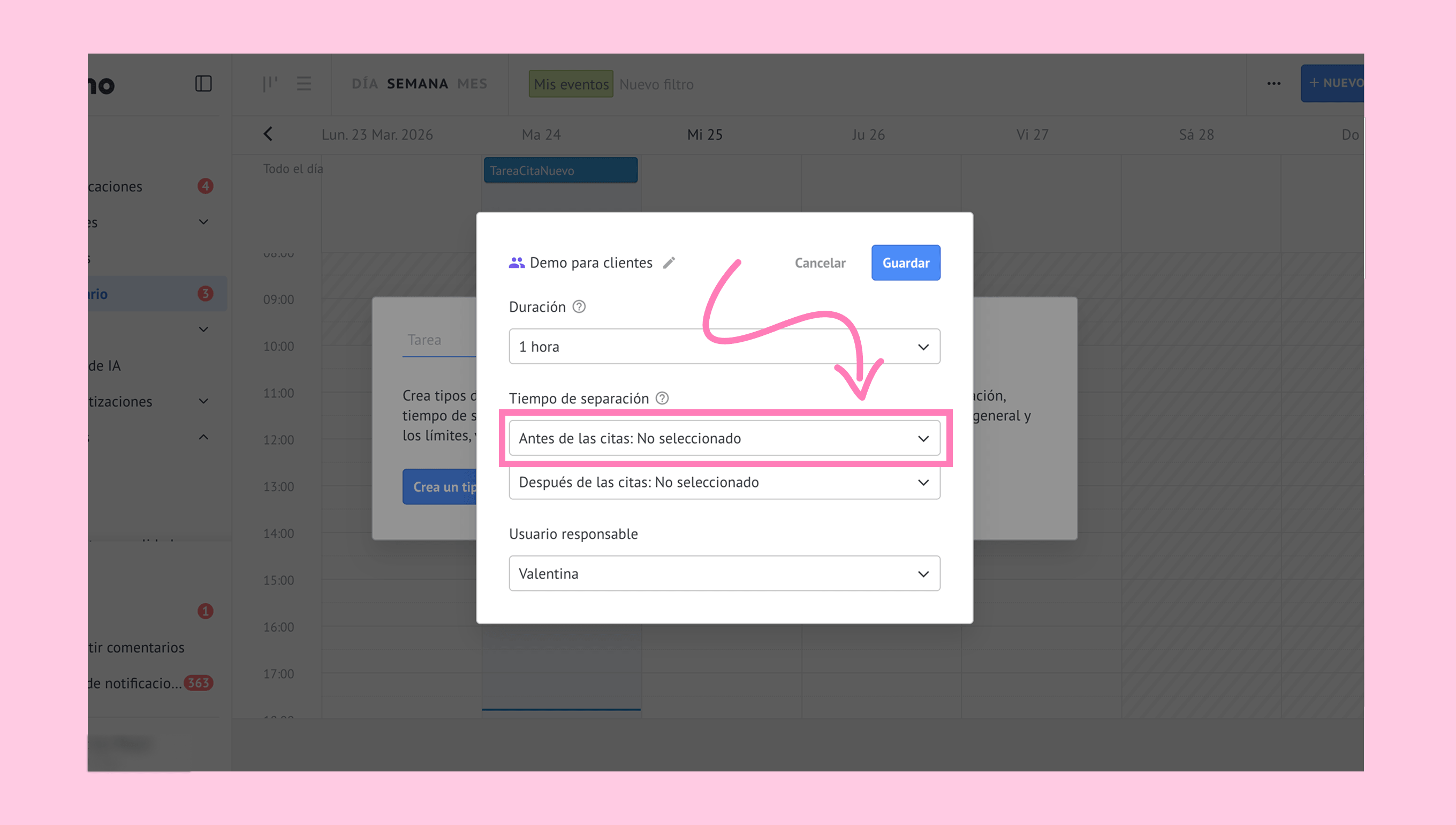Haz clic en el menú desplegable Antes de las citas. → Selecciona una opción.