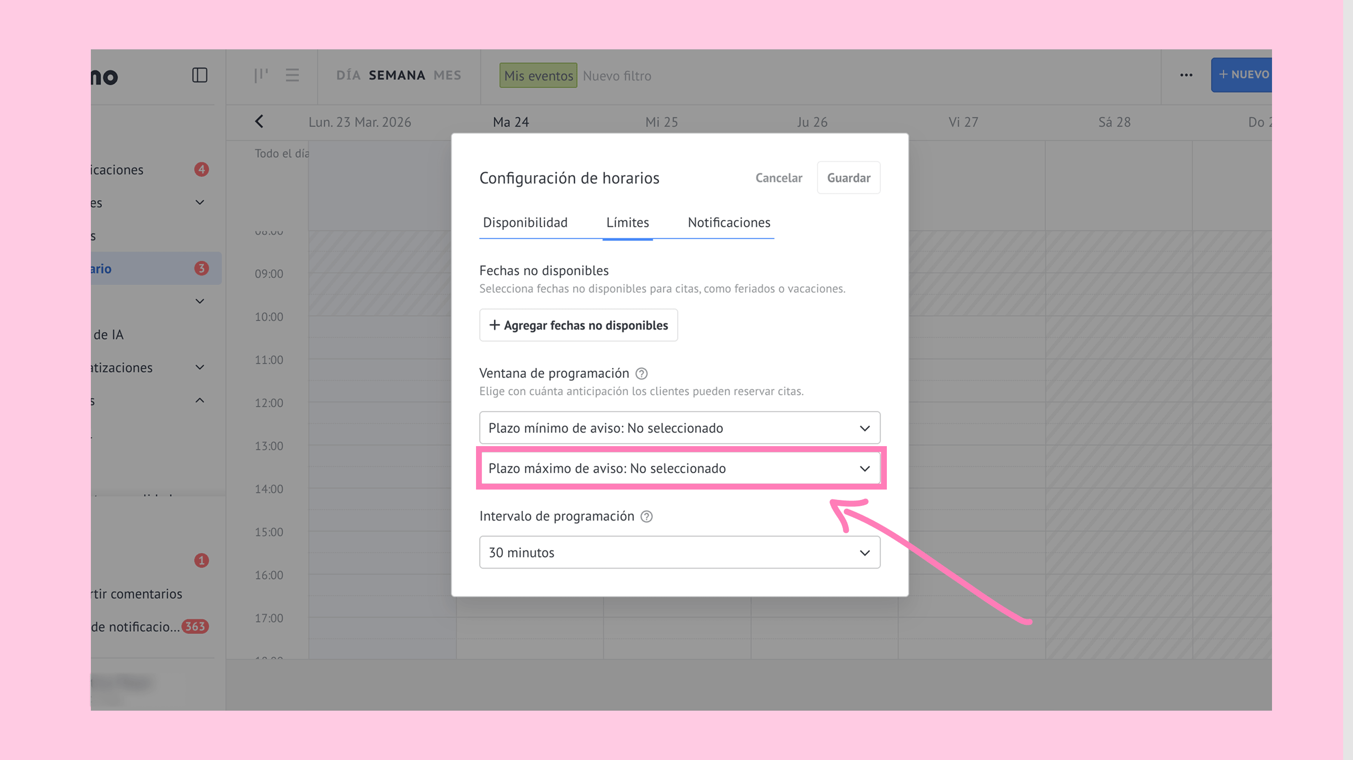 Haz clic en Plazo máximo de aviso. → Selecciona una opción (30 días, 2 meses, 3 meses o 6 meses). El plazo máximo de aviso es el tiempo máximo con el que se puede programar una cita. Los clientes solo pueden seleccionar fechas dentro de este límite. Por ejemplo, con un plazo máximo de aviso de 30 días, si un cliente reserva el 1 de marzo, la última fecha disponible será el 31 de marzo.