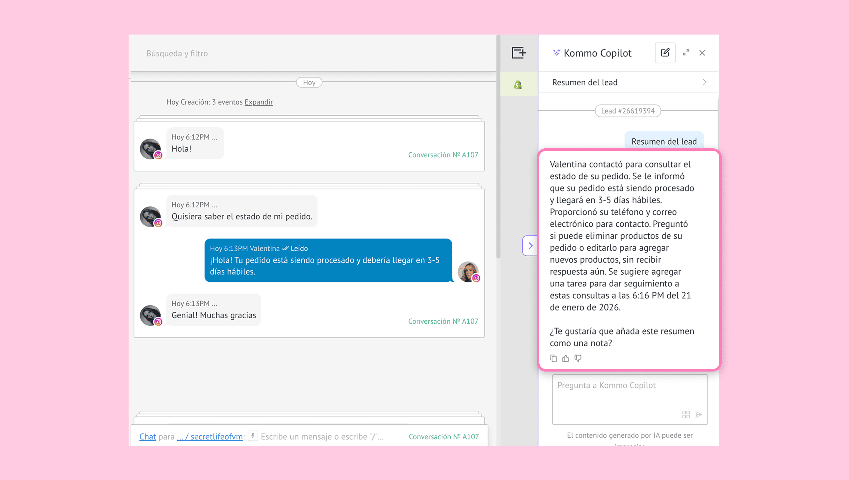 Copilot revisa chats, correos, tareas, notas y audios para sugerir valores en campos vacíos como nombre, correo o número de teléfono. Una vez que confirmas, los campos se actualizan automáticamente.