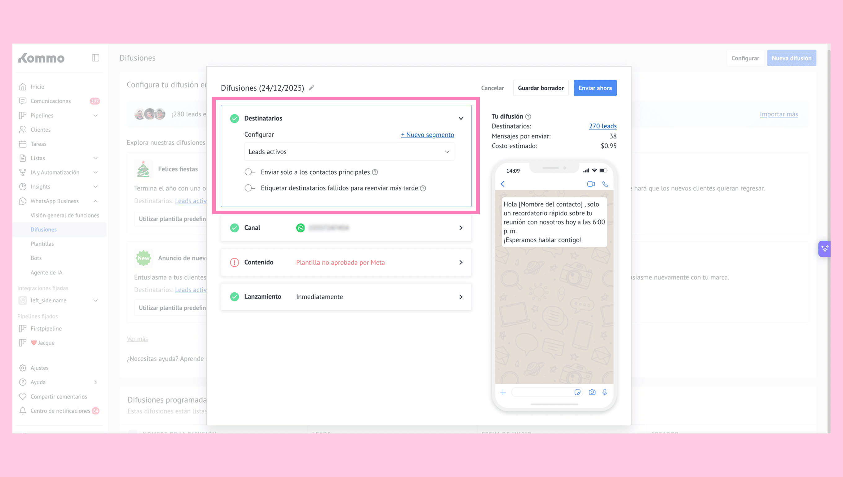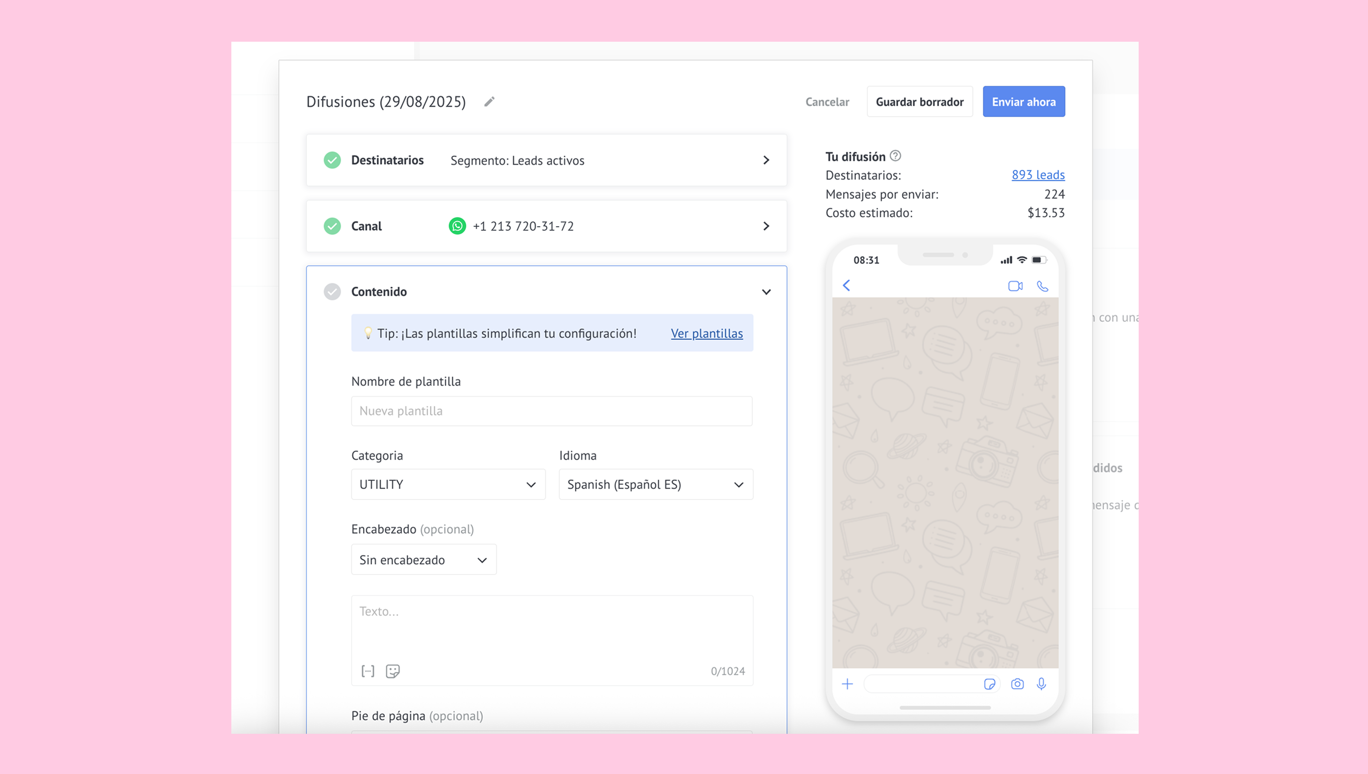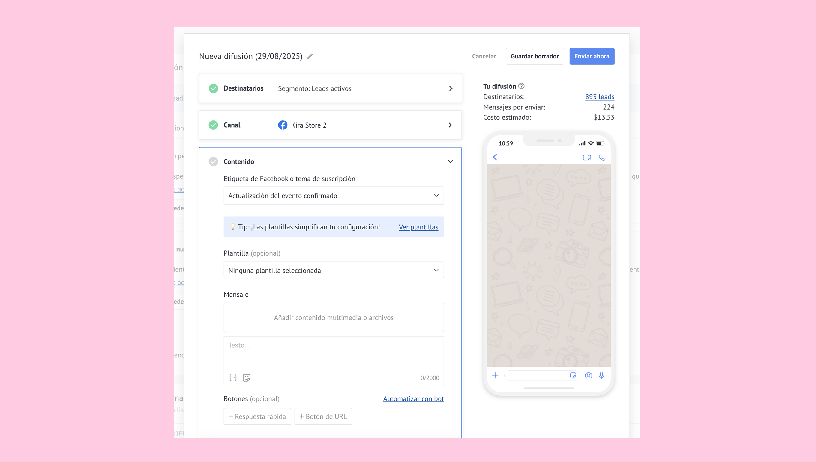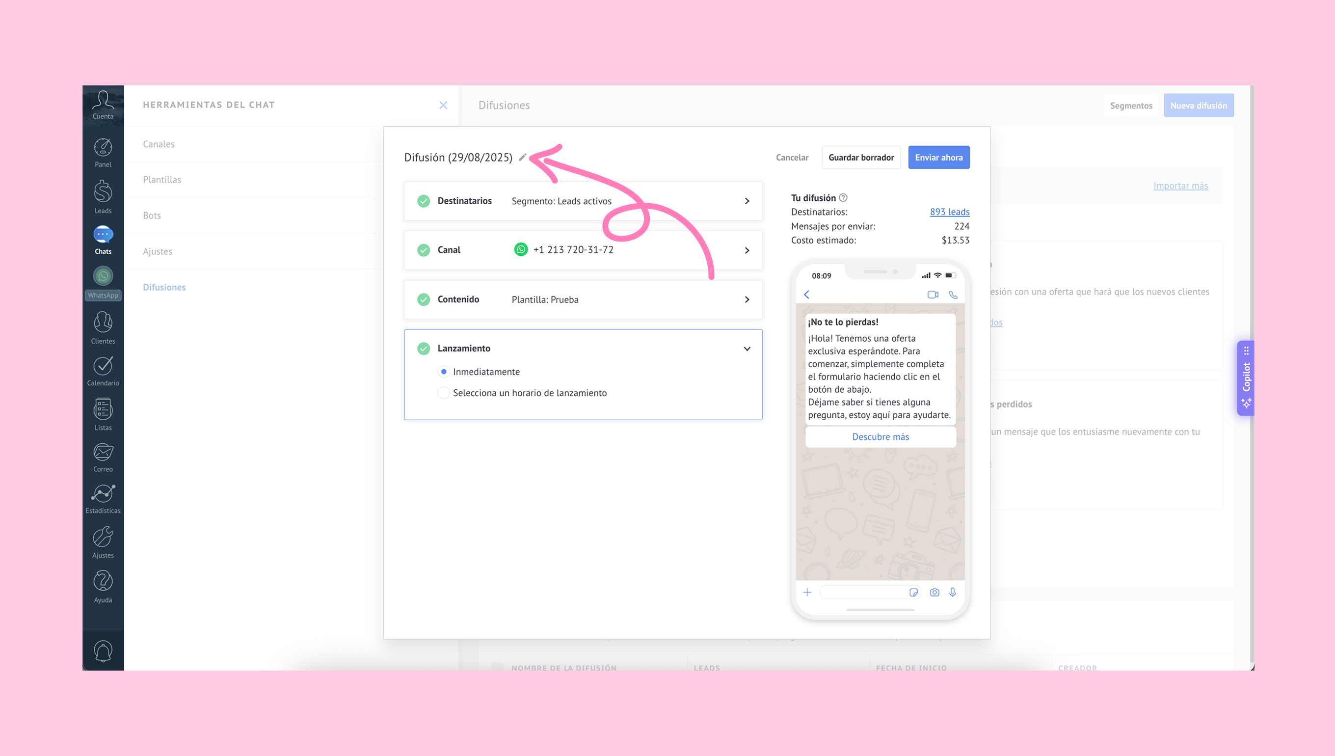 Finaliza la configuración de la difusión y envíala a tus leads.