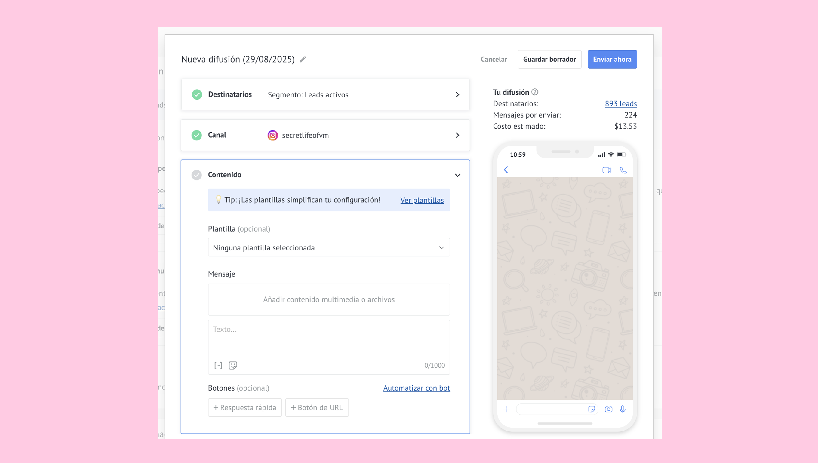 Para todos los demás canales, no se requiere aprobación previa de plantillas. Puedes crear difusiones desde cero – añade texto, imágenes, videos o botones. Utiliza la vista previa móvil para ver cómo se mostrará tu mensaje.
