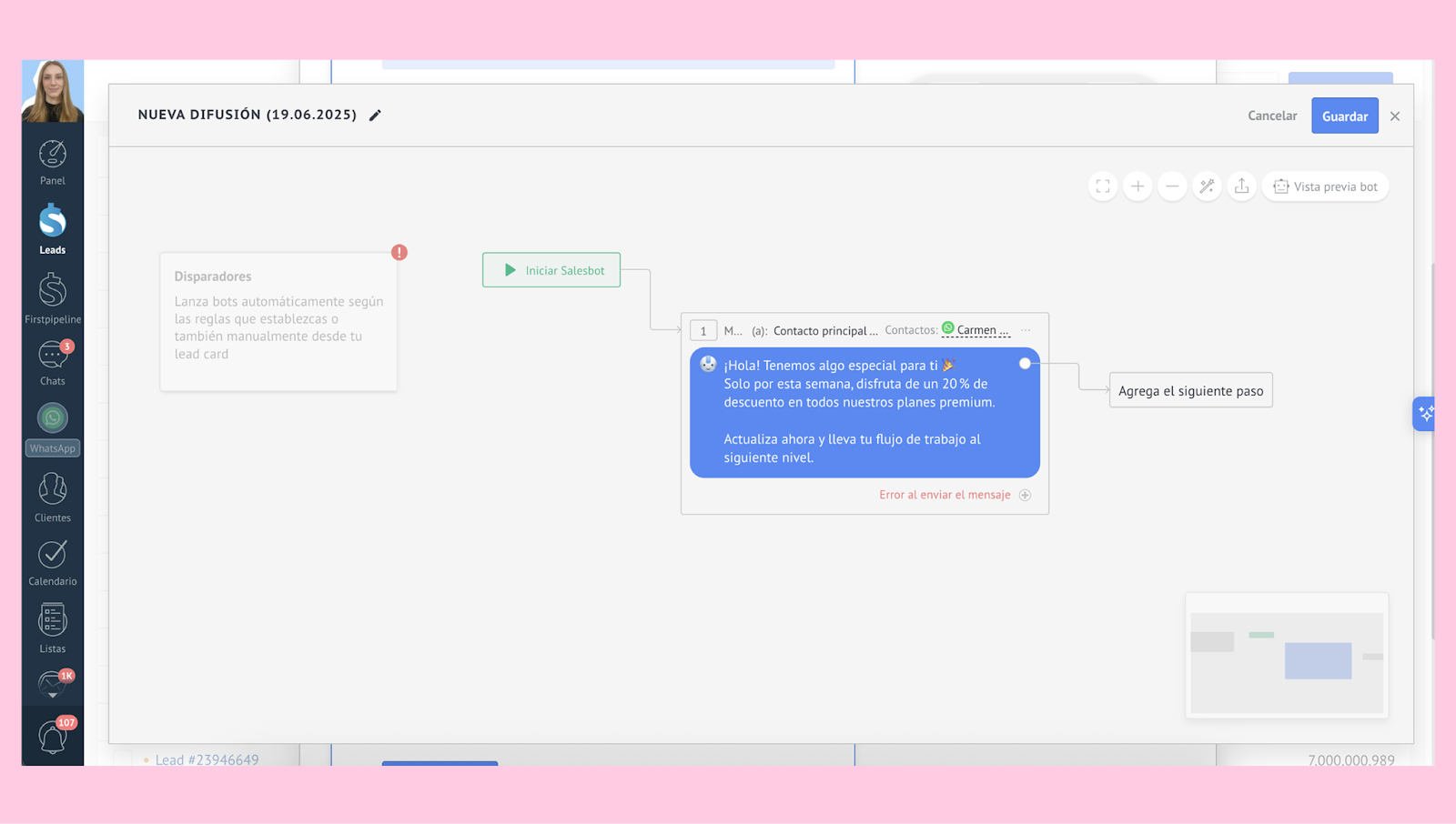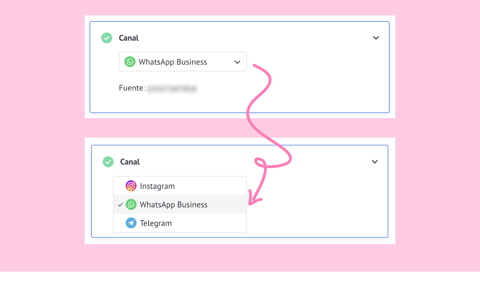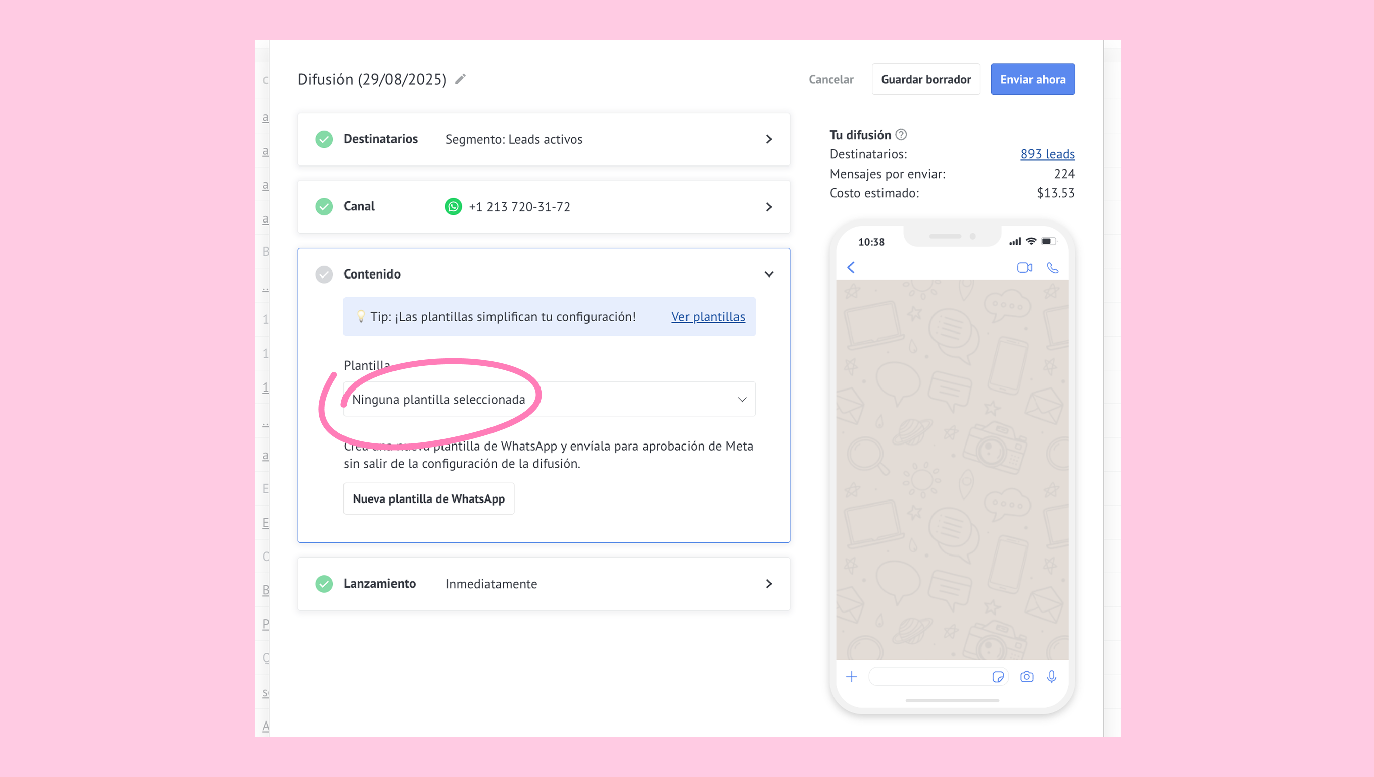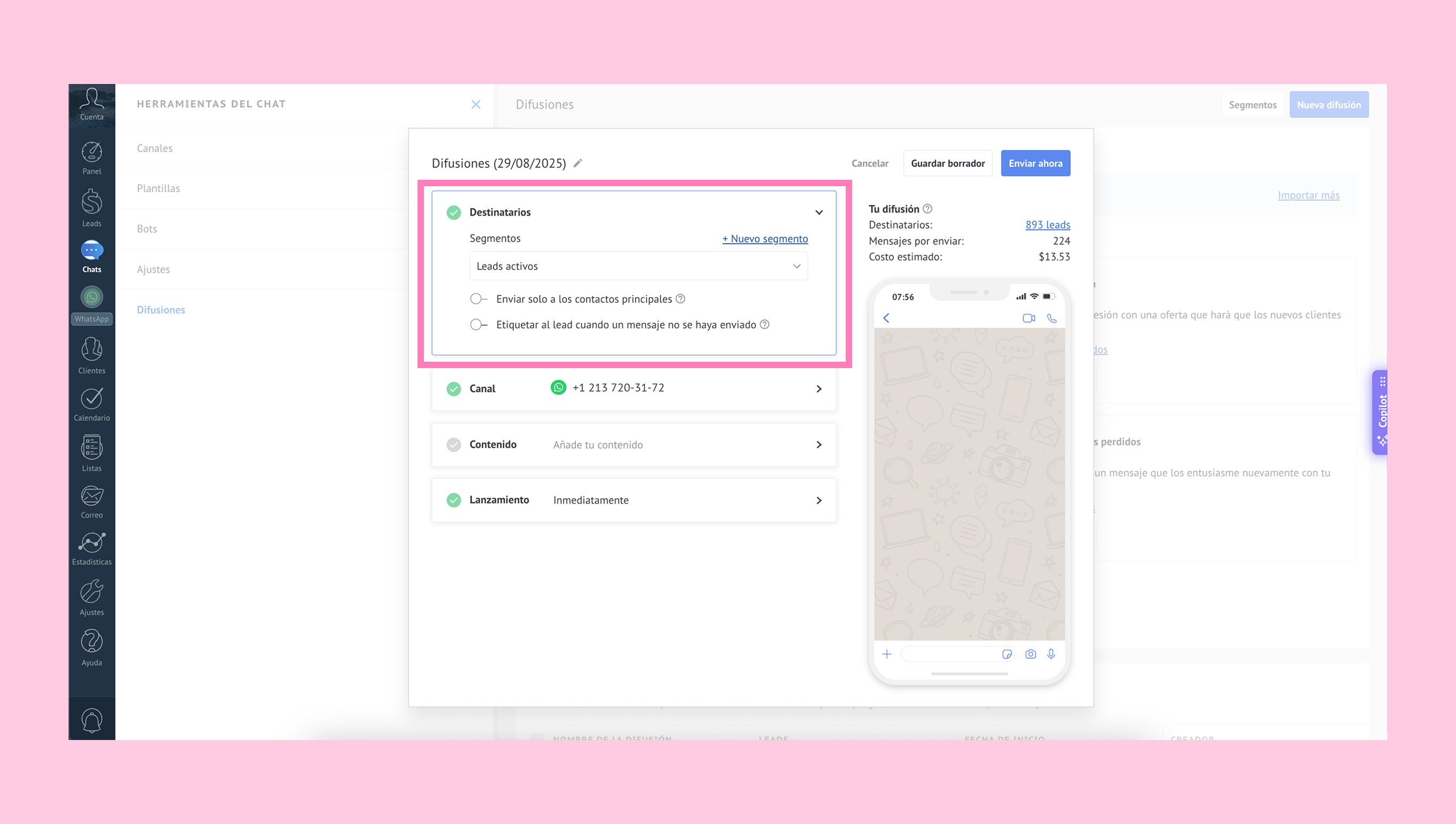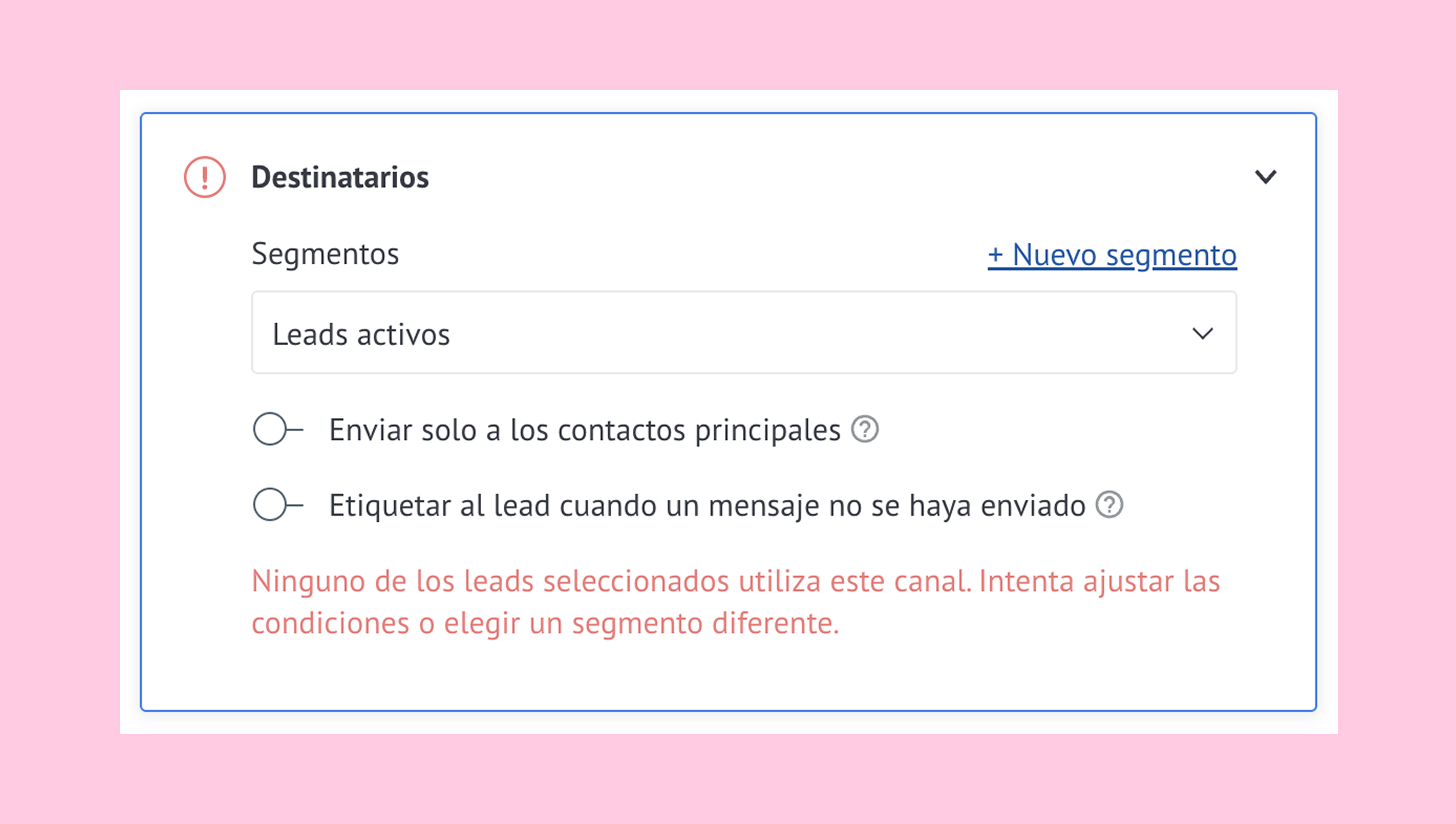 Nota: Asegúrate de que el canal seleccionado esté disponible para los destinatarios elegidos. Si un lead no puede ser contactado por ese canal, la difusión no se le enviará.