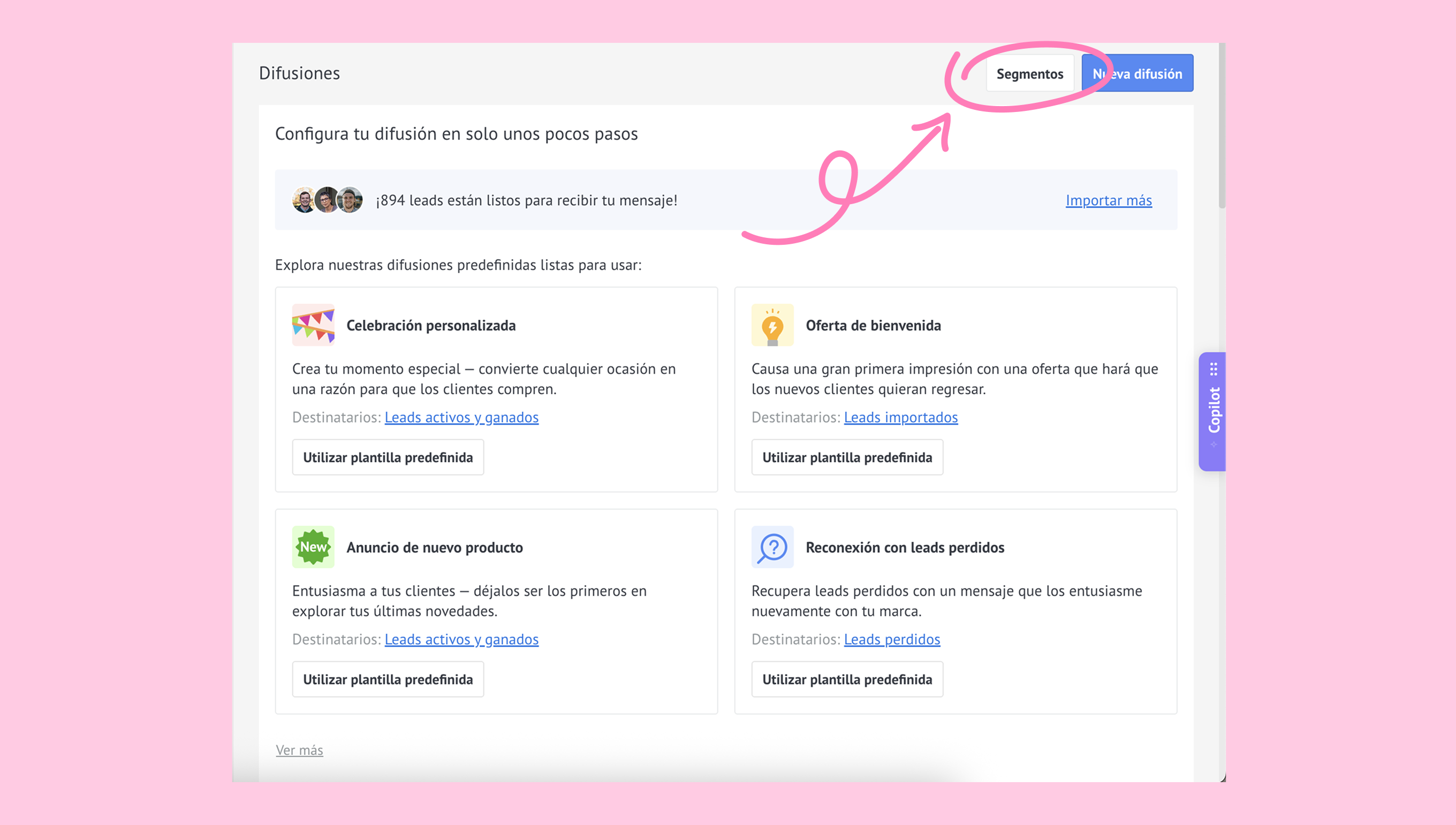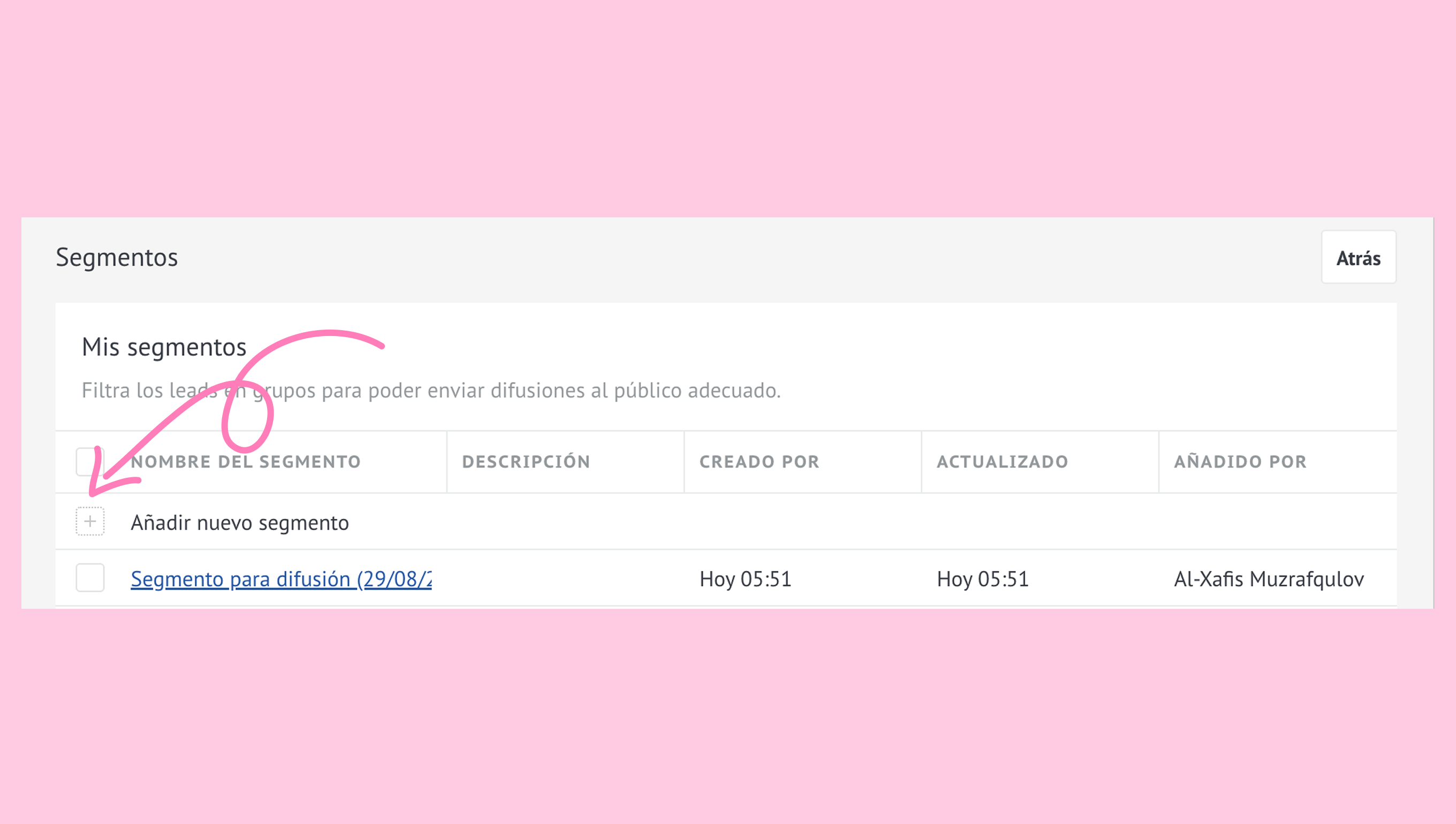 Puedes revisar tus segmentos en cualquier momento entrando a Difusiones y seleccionando Segmentos: