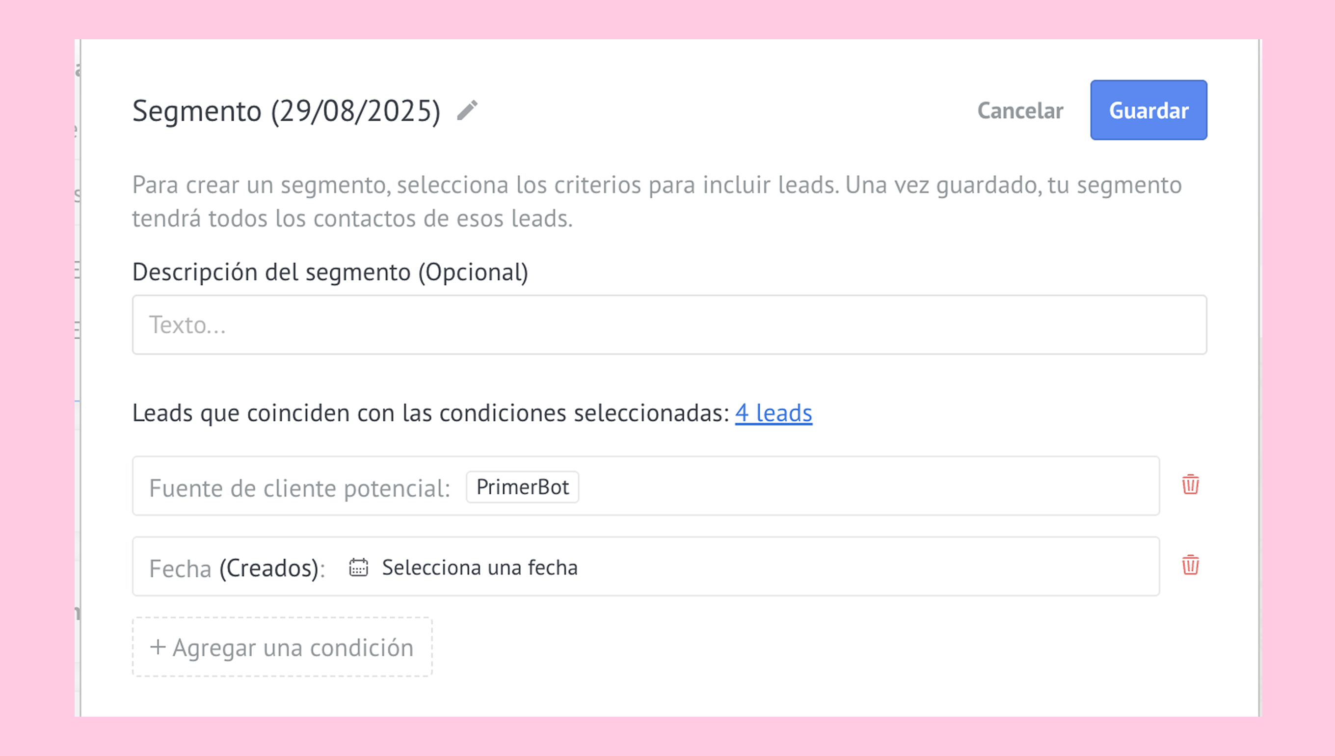 Para crear un segmento, define las condiciones que se utilizarán para filtrar los leads. Estas condiciones determinan qué leads se incluirán en el segmento. Por ejemplo, puedes filtrar por nombre del lead, etiqueta o fuente del lead. Cuando las condiciones estén configuradas, el sistema agrupará automáticamente todos los leads que coincidan en un segmento que podrás utilizar en tu difusión.