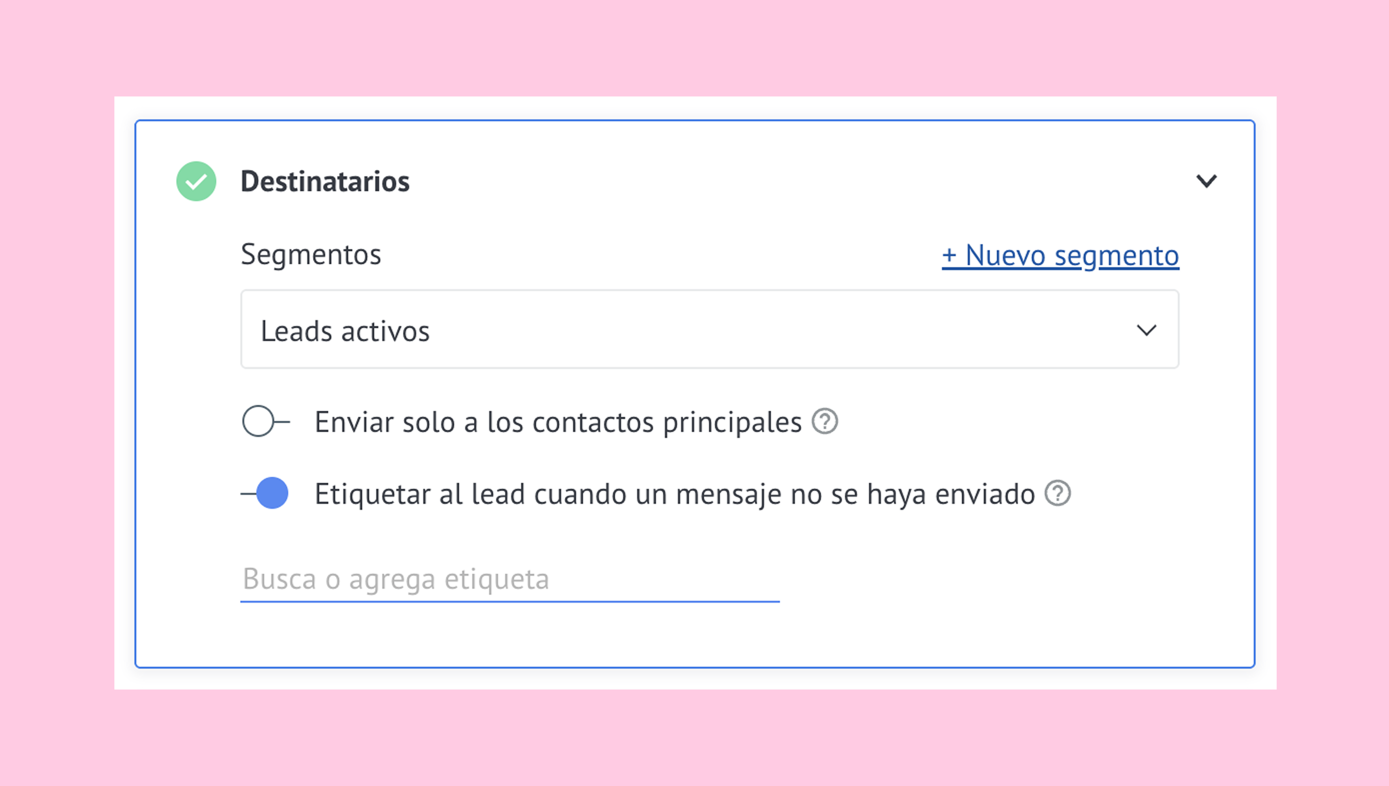 Utiliza Etiquetar al lead cuando un mensaje no se haya enviado para marcar a los leads que no recibieron la difusión, así podrás darles seguimiento fácilmente más adelante. Puedes ingresar o seleccionar solo una etiqueta existente. La etiqueta permanecerá disponible para uso futuro, incluso si la eliminas de la configuración actual.