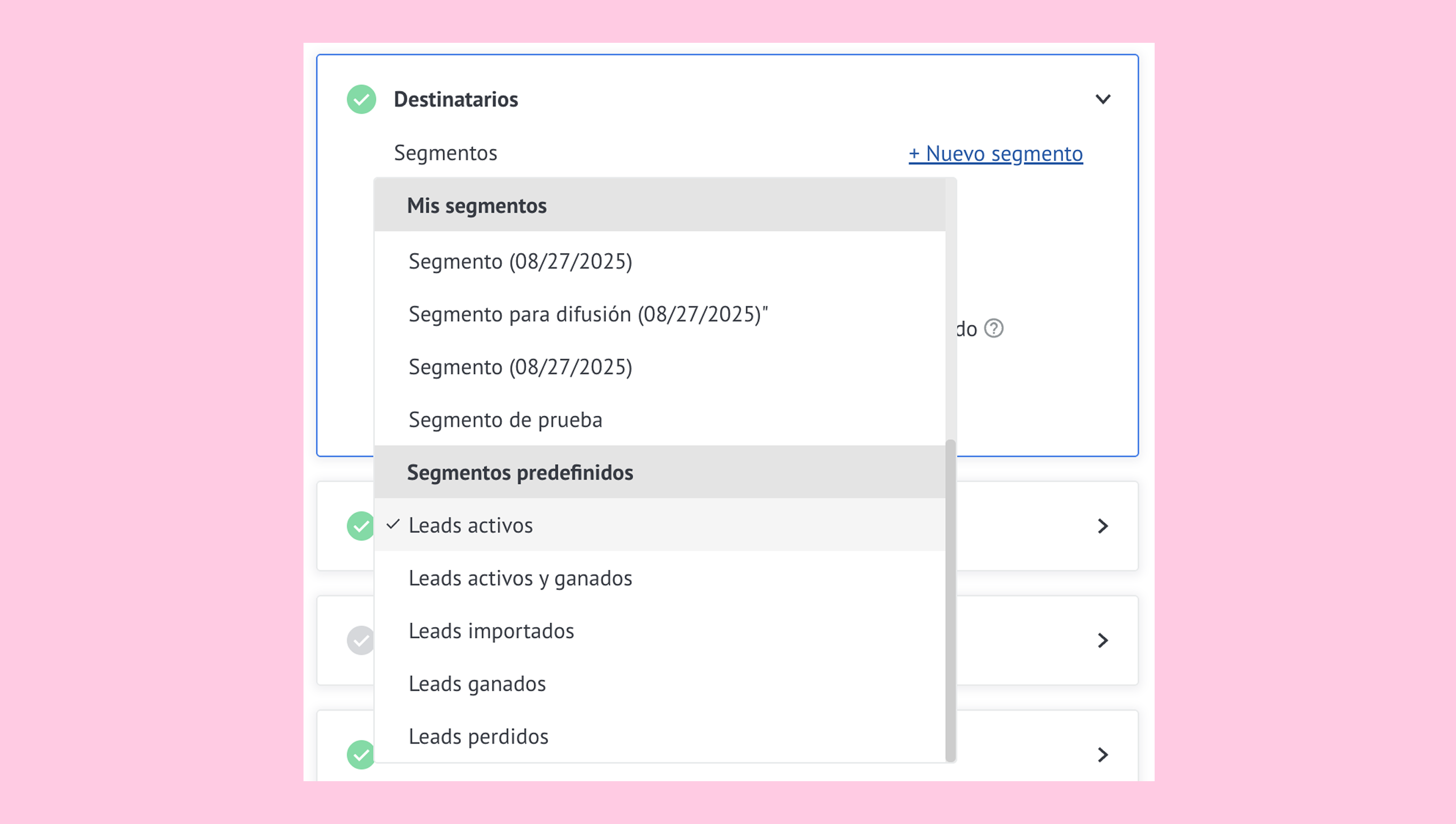 La gestión de destinatarios está integrada en el creador de difusiones. Puedes crear un segmento personalizado o elegir uno predefinido – de forma predeterminada, se selecciona Leads activos.
