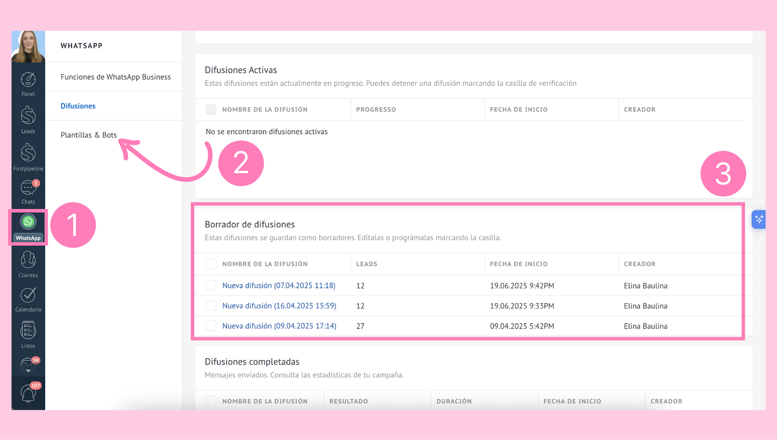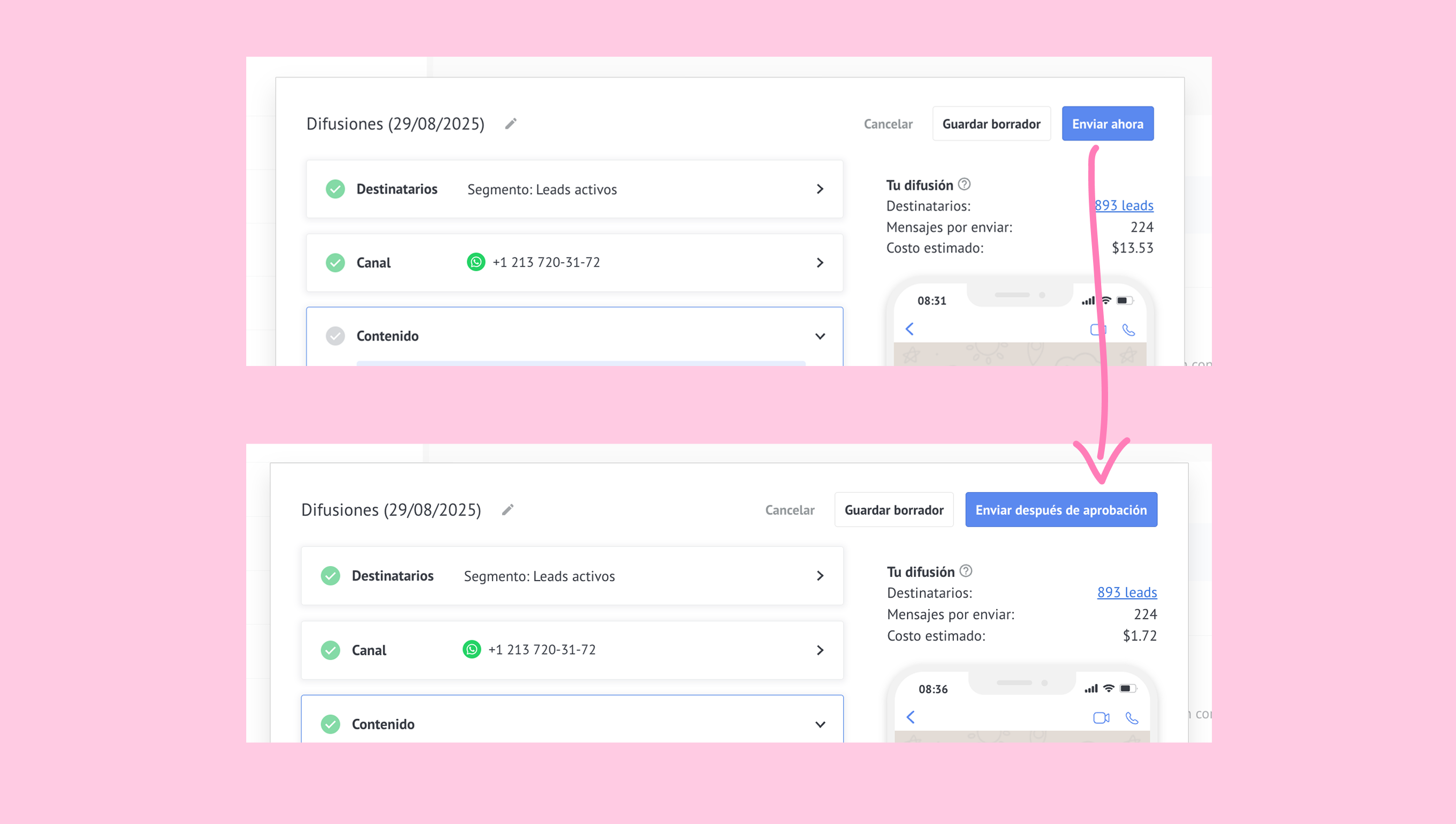 Una vez aprobada, recibirás un correo con un enlace, o podrás encontrar el borrador en WhatsApp > Difusiones.