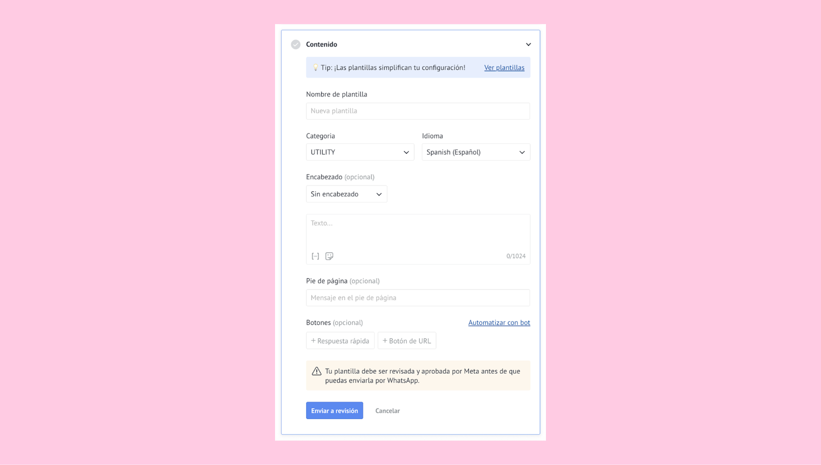 Se abrirá el constructor de plantillas de WhatsApp. Completa los campos requeridos y envía tu plantilla para la revisión de Meta. Para obtener más información, consulta nuestro artículo WhatsApp Cloud API: Plantillas de mensaje.