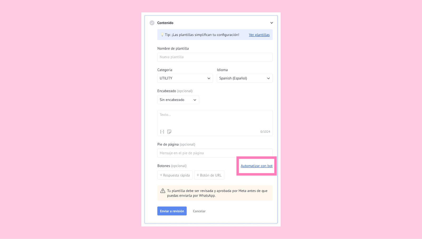 Haz clic en Enviar a revisión. La revisión suele tardar entre 1 minuto y 48 horas. No puedes editar la plantilla durante este tiempo.