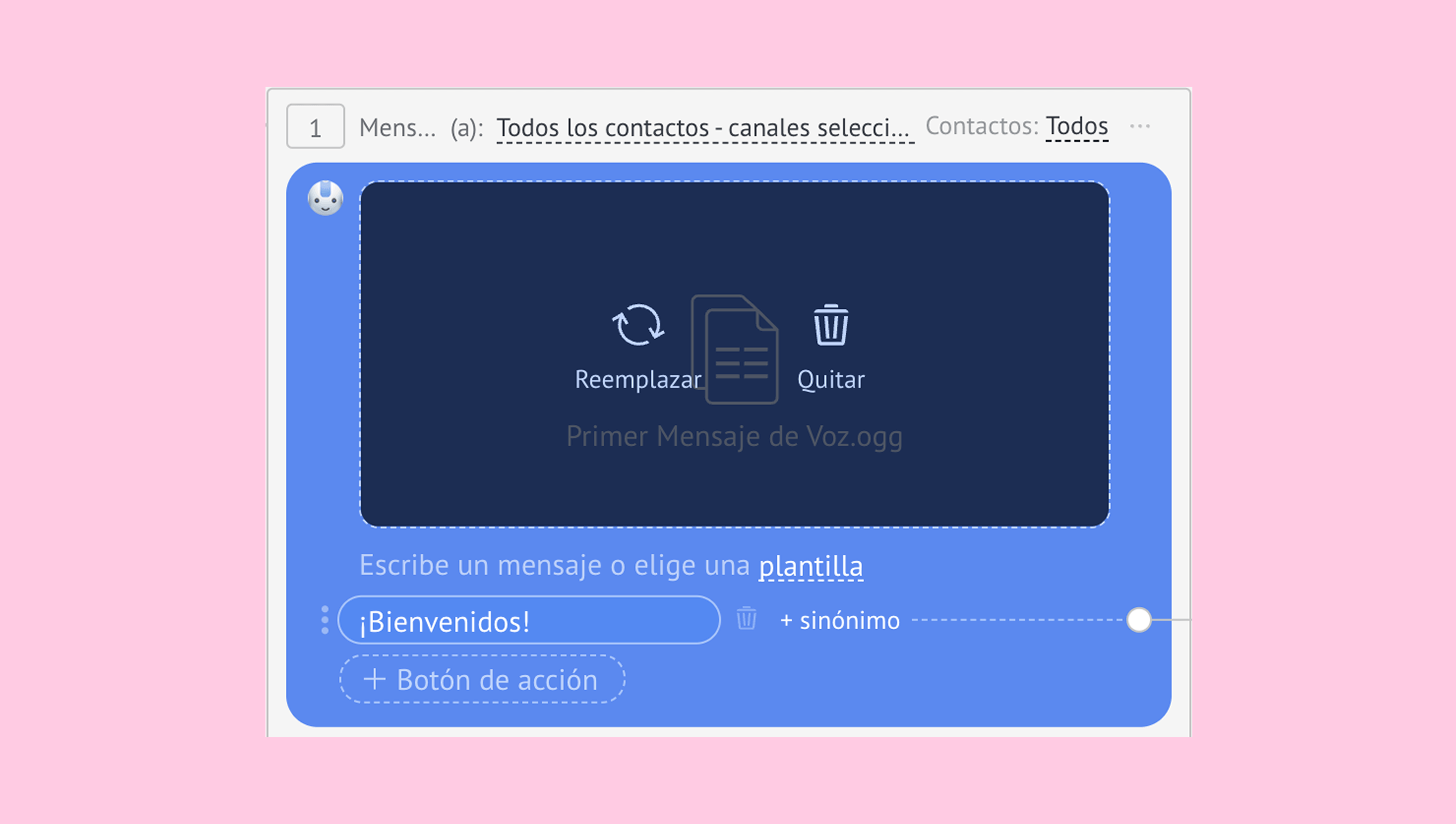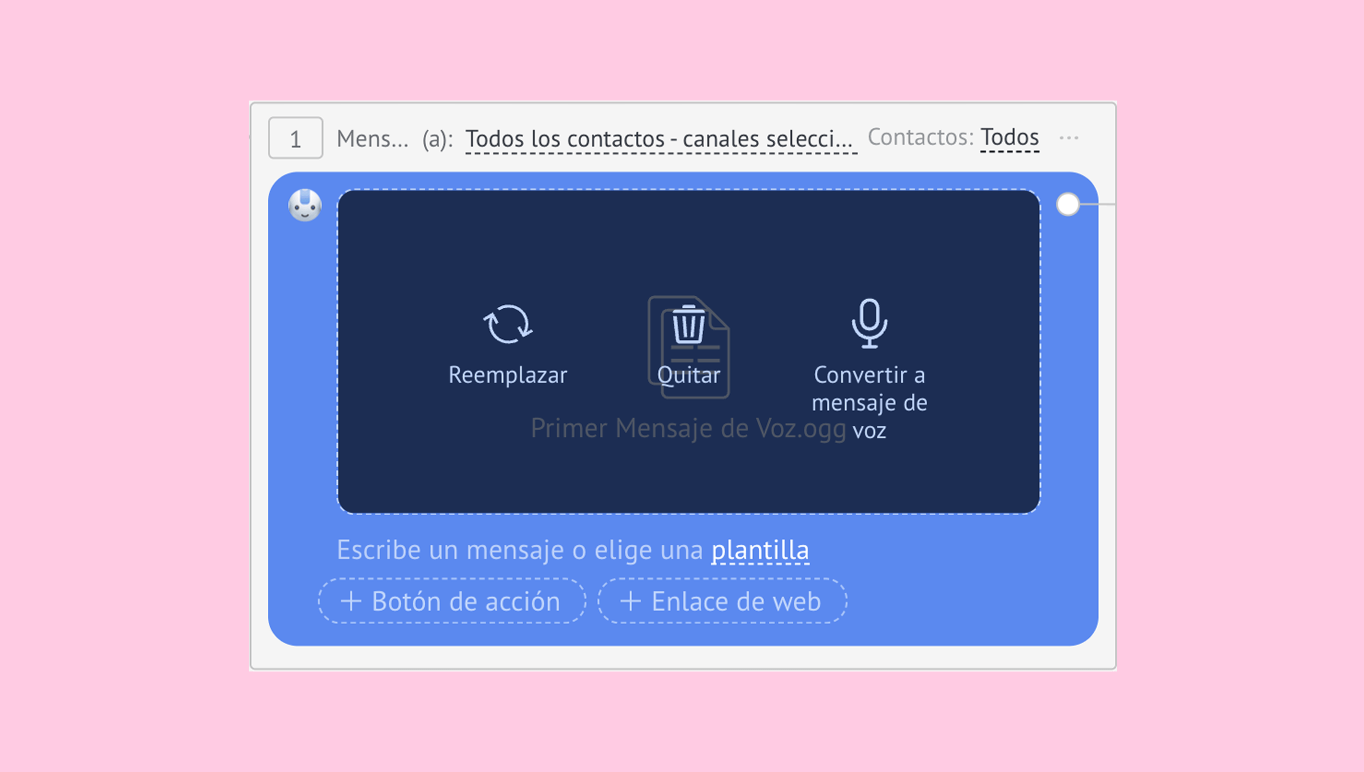 Nota: Si añades texto o un botón en el paso, el archivo no podrá convertirse en un mensaje de voz. En su lugar, el audio se enviará como un archivo que los clientes podrán descargar para escucharlo. Además, solo estarán disponibles los botones de Reemplazar y Quitar en el paso.