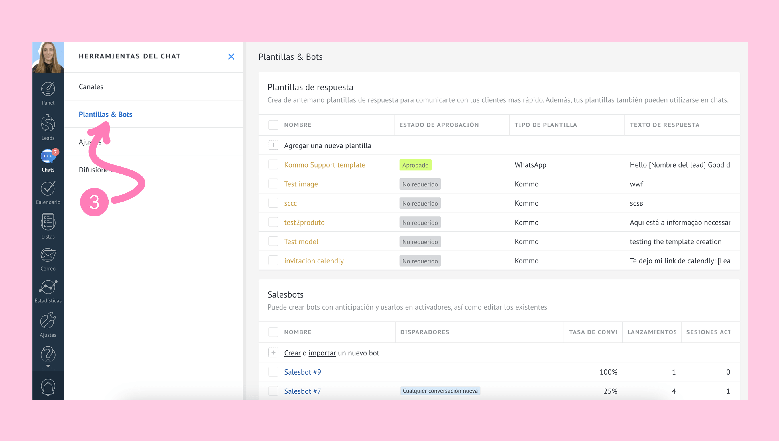 • Desde Chats → Ícono de engranaje → Plantillas & Bots → Salesbot