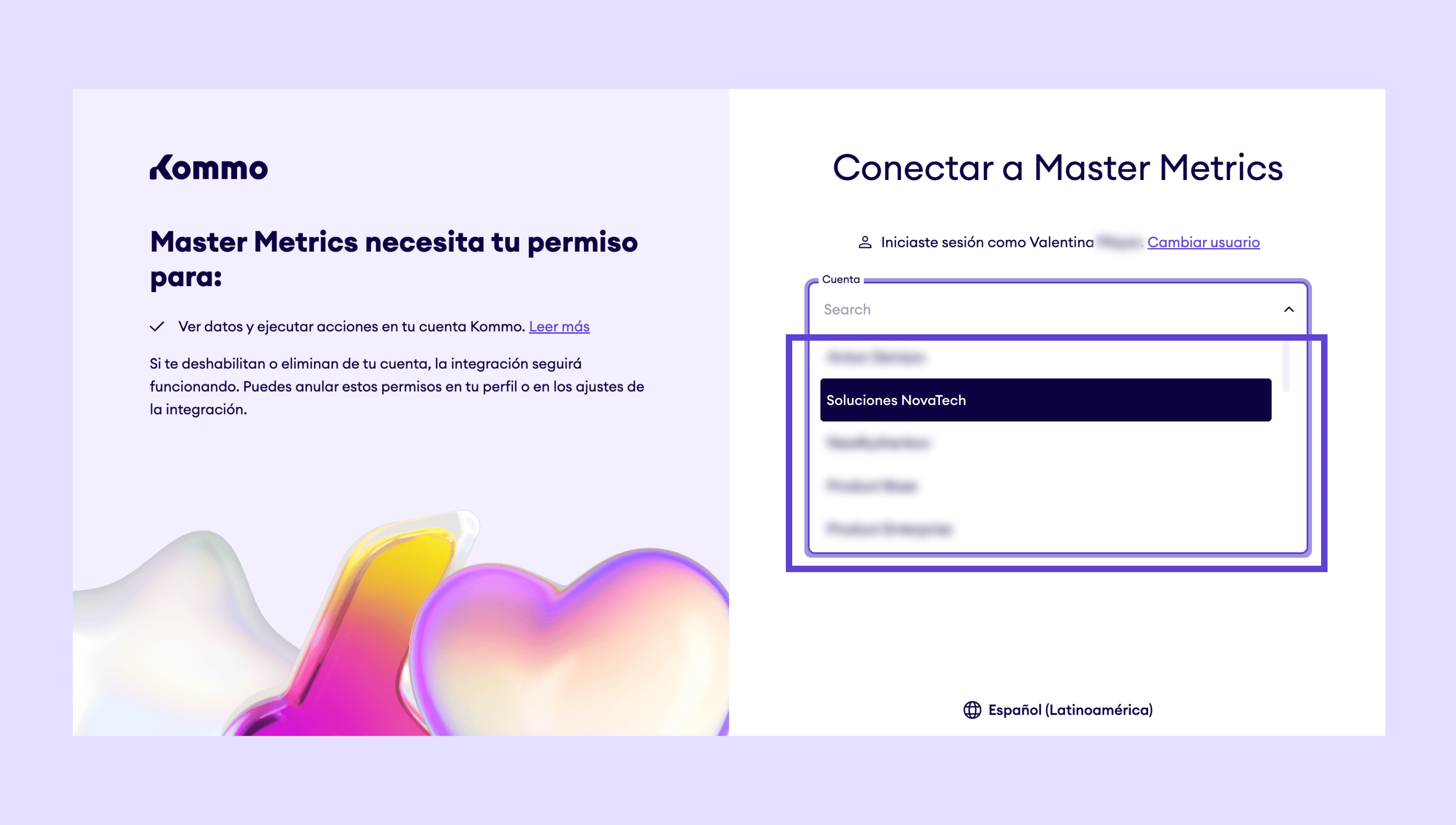 - Se te redirigirá a una página de autorización de Kommo. Elige la cuenta que deseas conectar.
