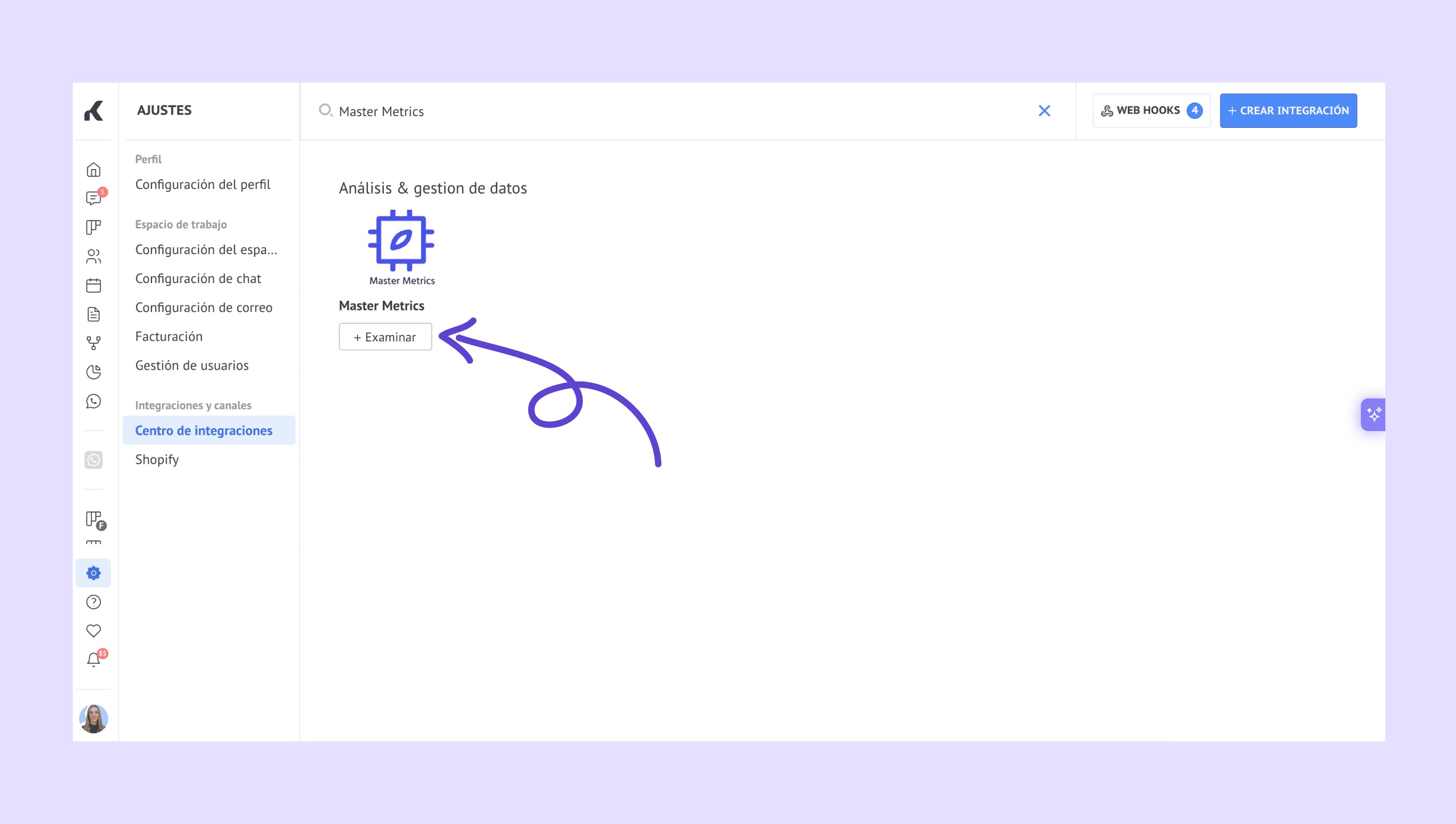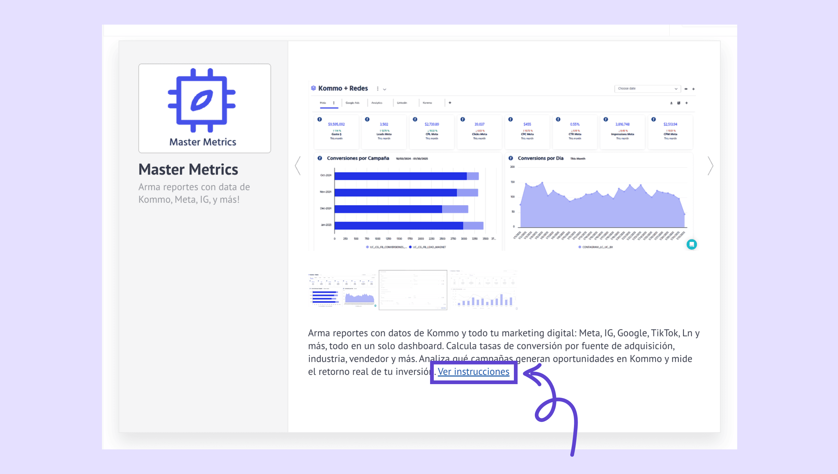 Importante: La conexión se realiza desde el sitio web de Master Metrics. No es necesario instalar la integración desde el Marketplace de Kommo.