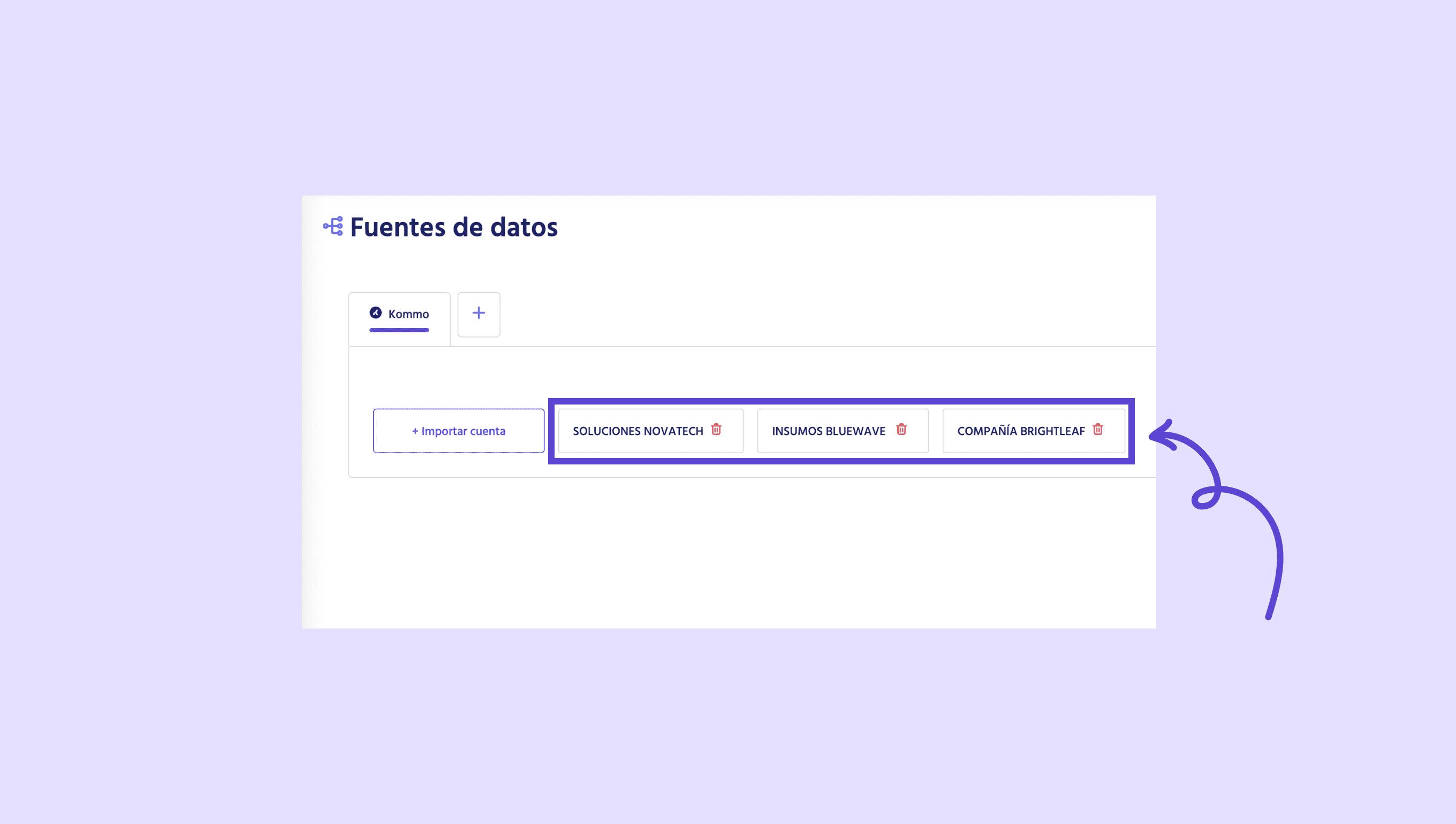 Verás todas las cuentas de Kommo conectadas listadas junto al botón + Importar cuenta.