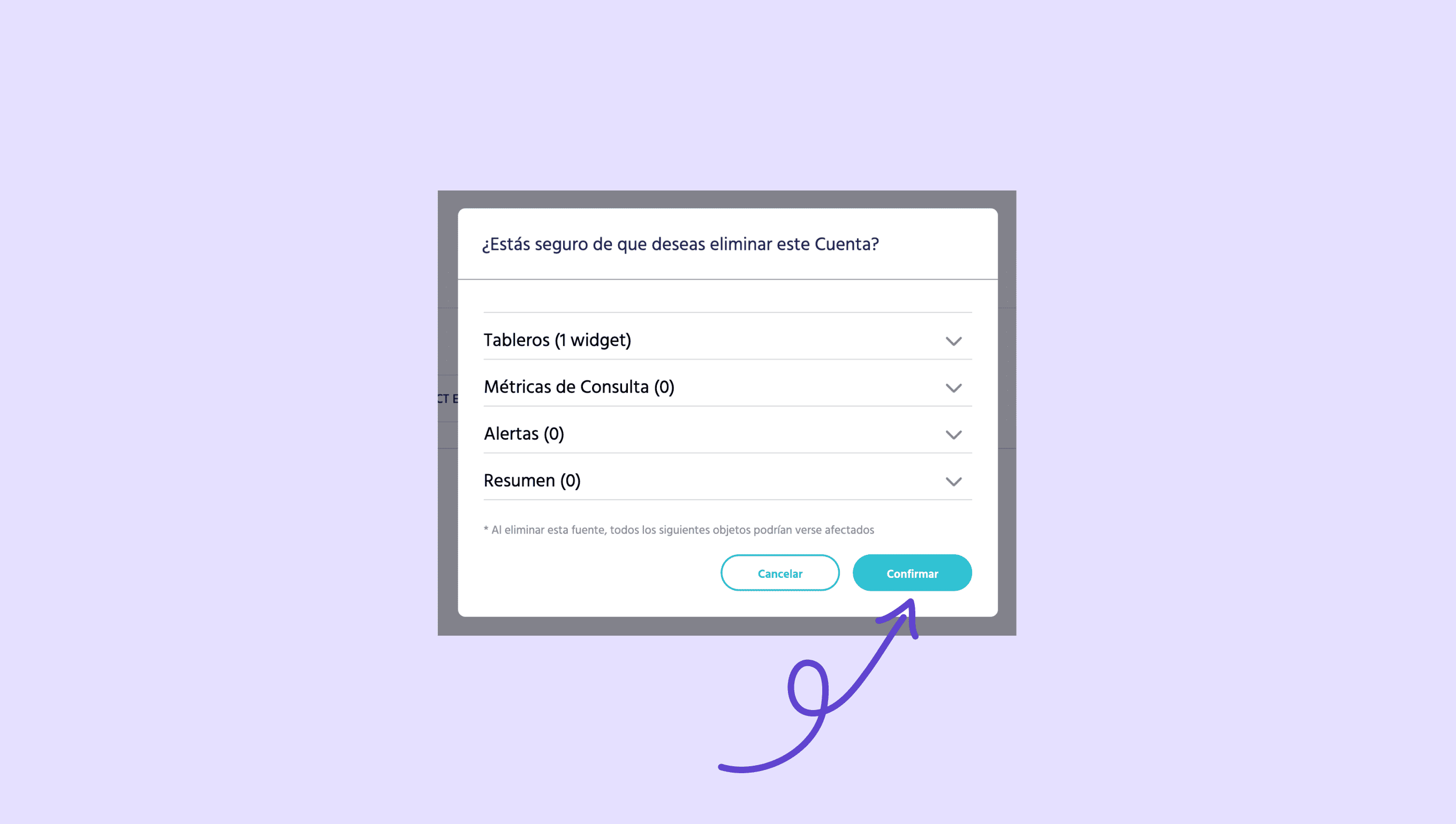 Aparecerá una ventana de confirmación que mostrará todos los objetos creados con esa cuenta. Haz clic en Confirmar para desconectarla.