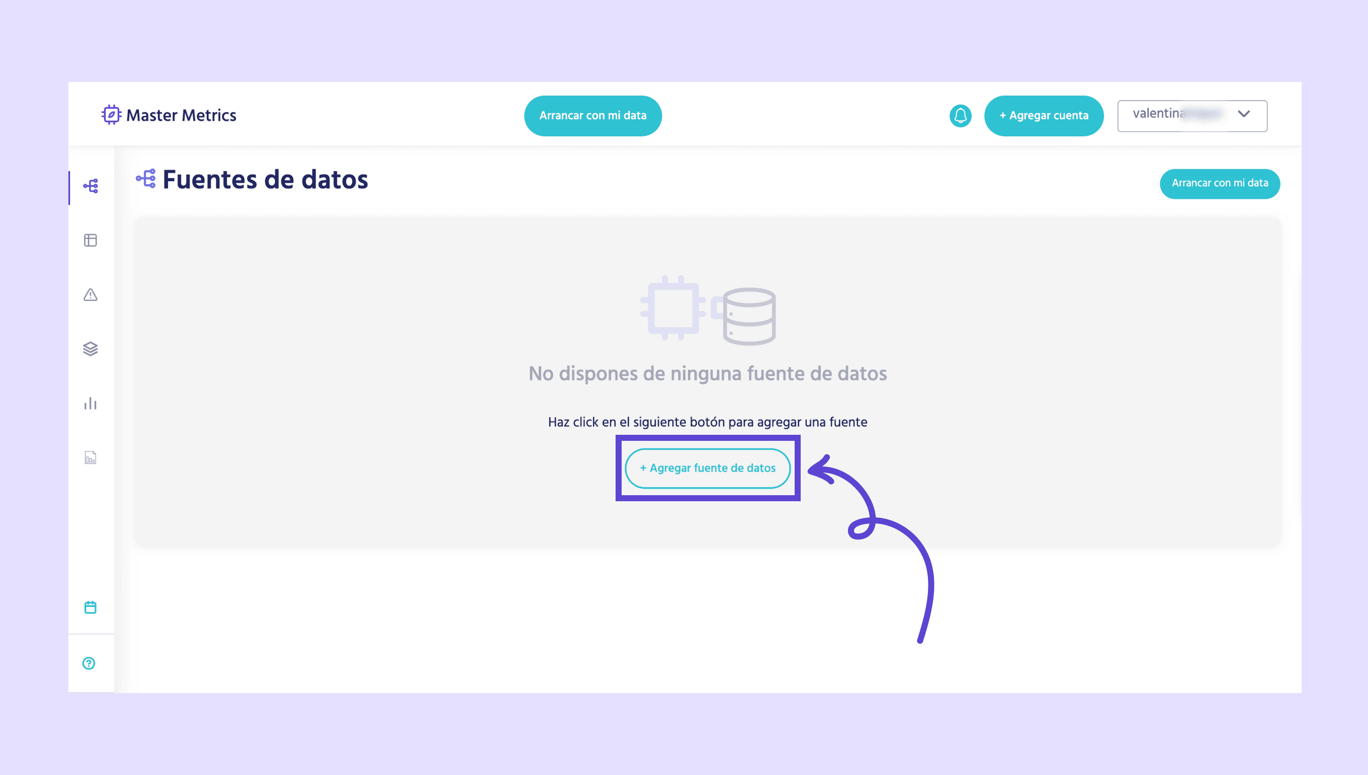 Una vez que hayas iniciado sesión, abre la barra lateral y selecciona Fuentes de datos.