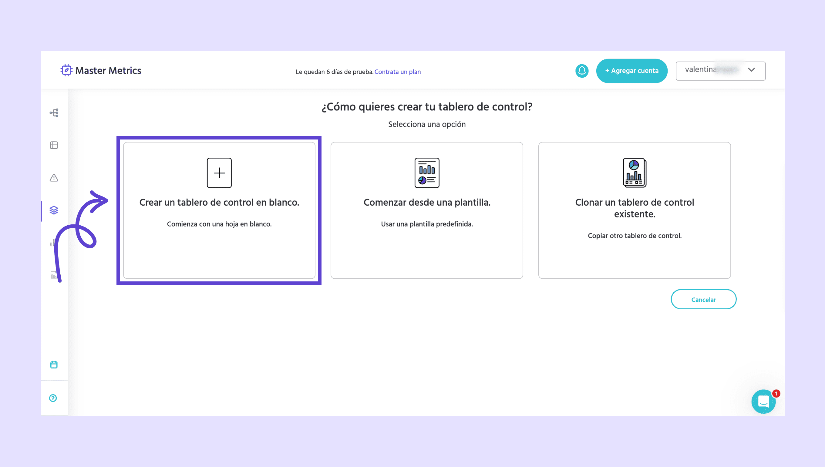 Verás tres opciones: Crear un tablero de control en blanco, Comenzar desde una plantilla y Clonar un tablero de control existente. -
