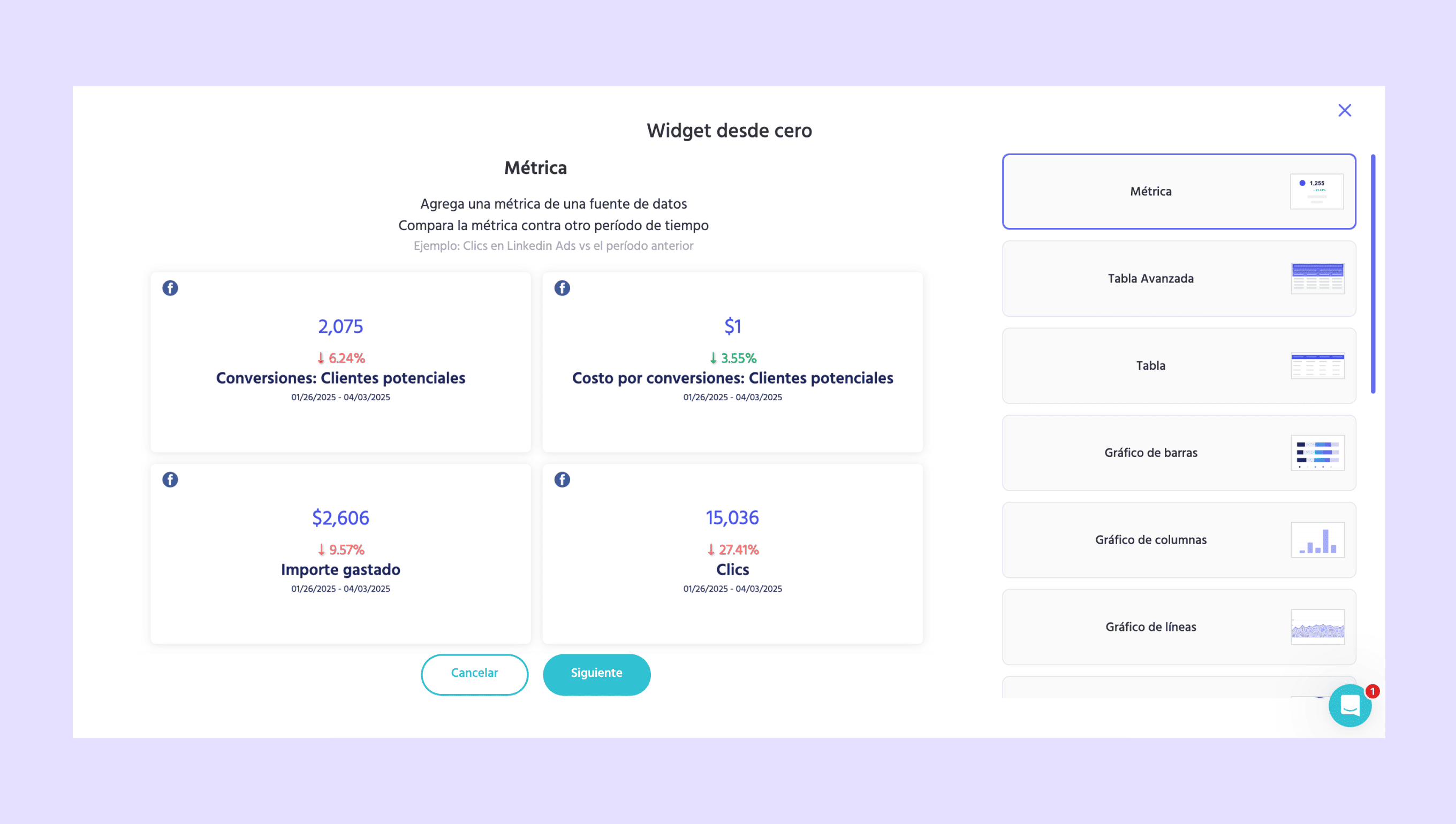 Métrica (tarjeta) — Muestra un único número clave en una tarjeta compacta, como el total de leads, valor de negocios, contactos o compañías para un período seleccionado. -