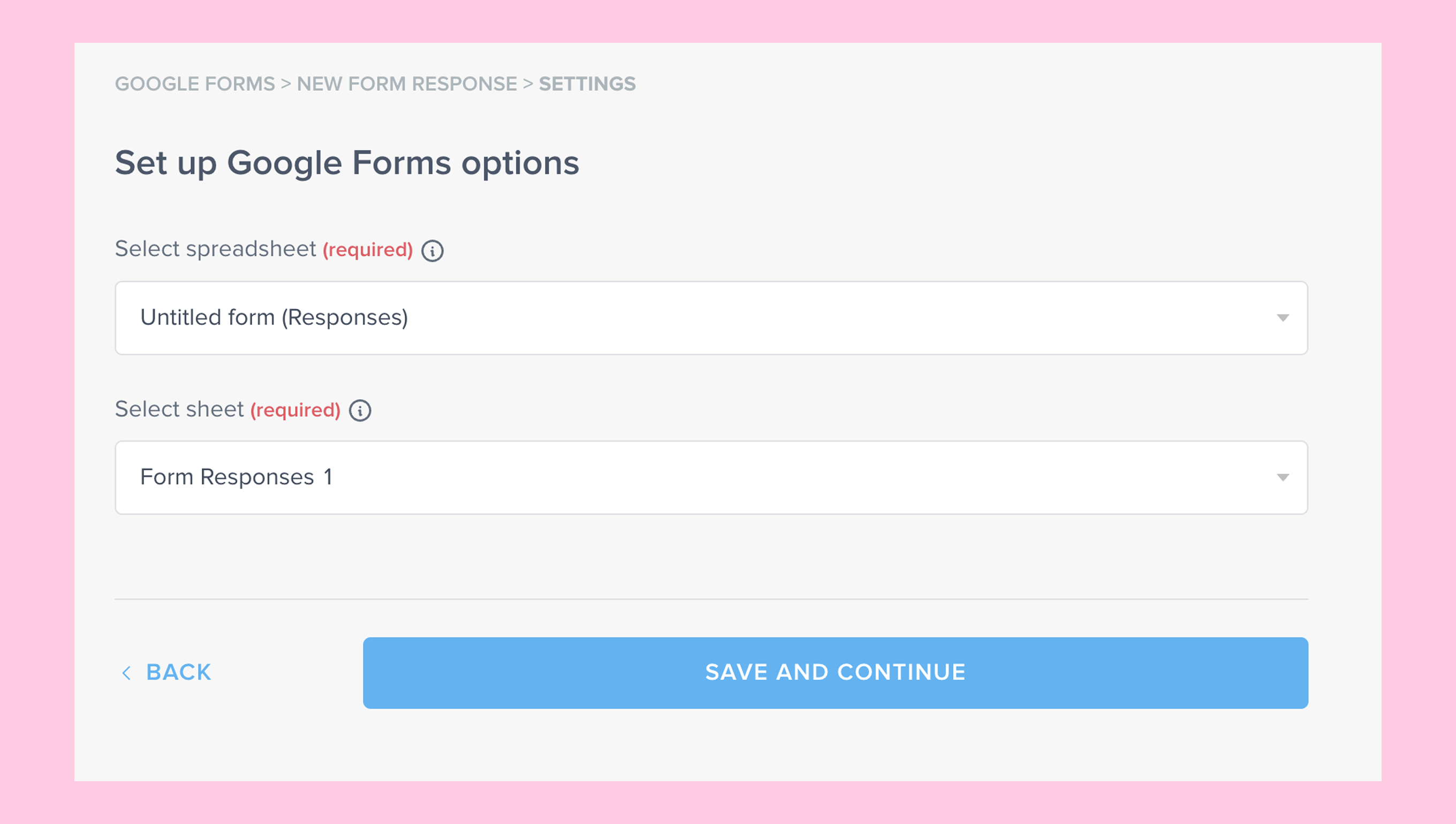 Selecciona la hoja de cálculo y la pestaña en Pluga, luego haz clic en Save and continue.