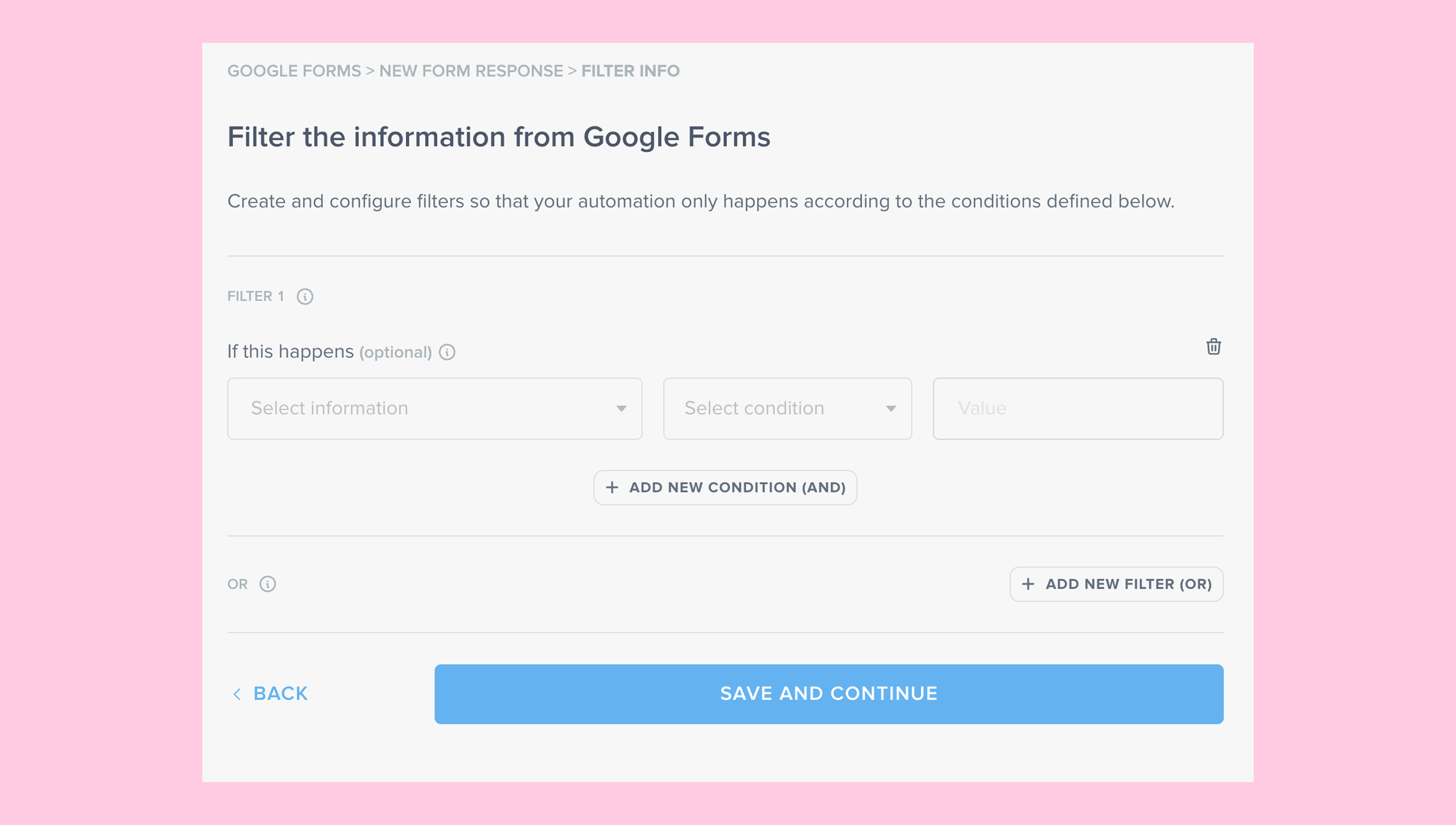 Haz clic en Continue. Con la función de filtros de Pluga, puedes definir criterios usando valores de Kommo, como puntuación de leads, fecha de creación, parámetros UTM y más para activar tu automatización.