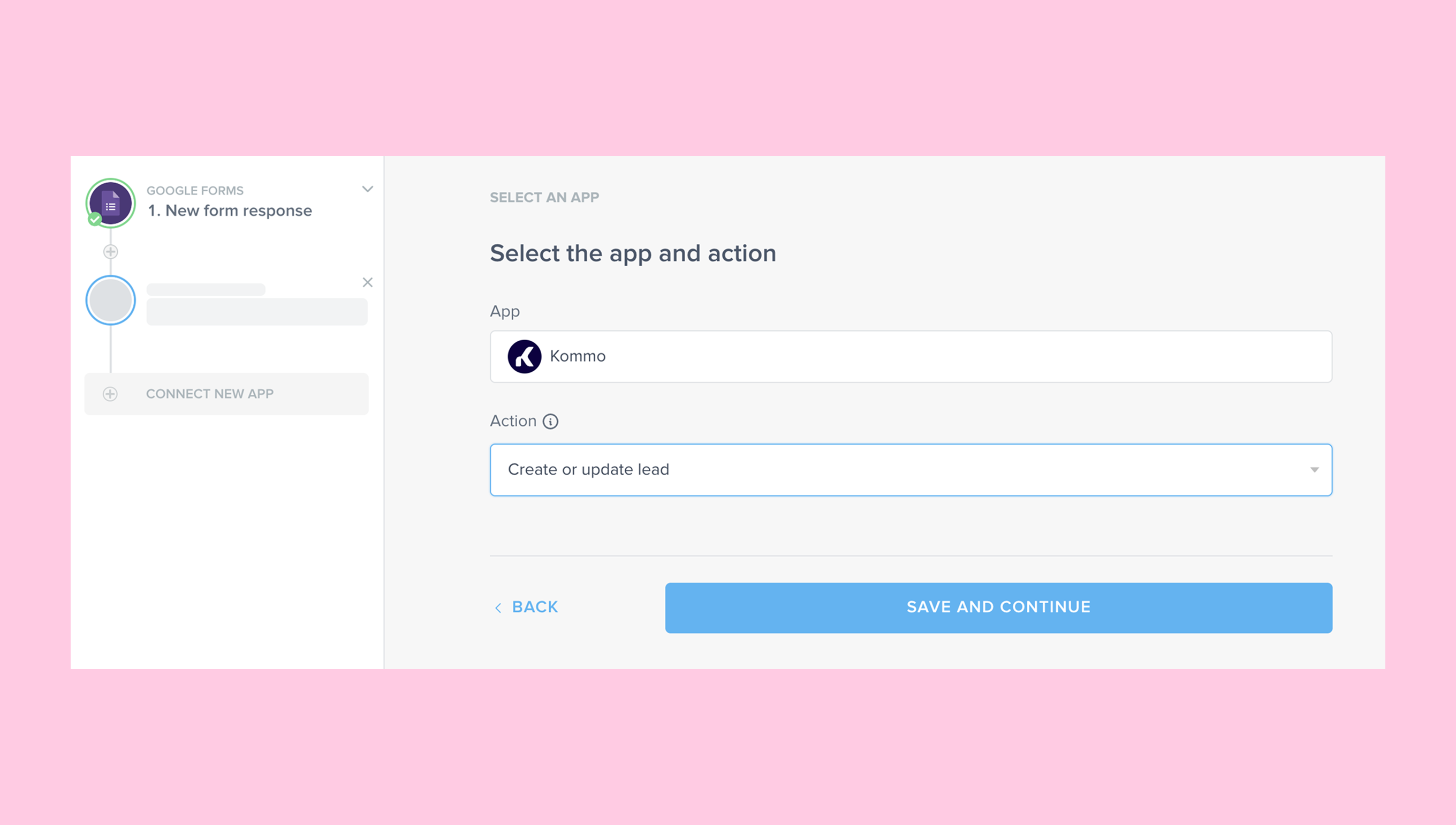 Elige Kommo como la aplicación de destino y selecciona Create or update lead.