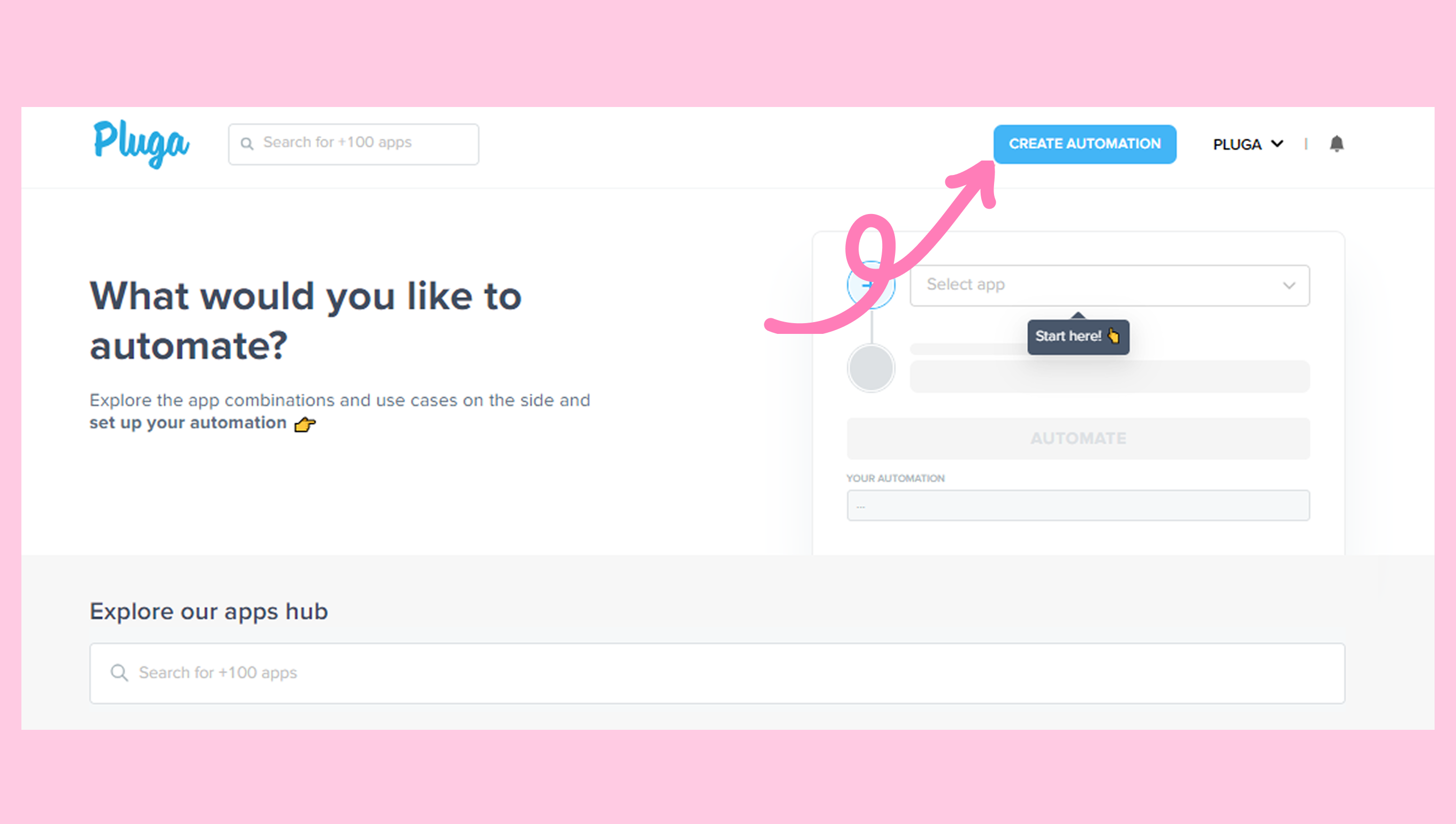 En Pluga, selecciona la aplicación y especifica la acción que debe realizar la automatización.