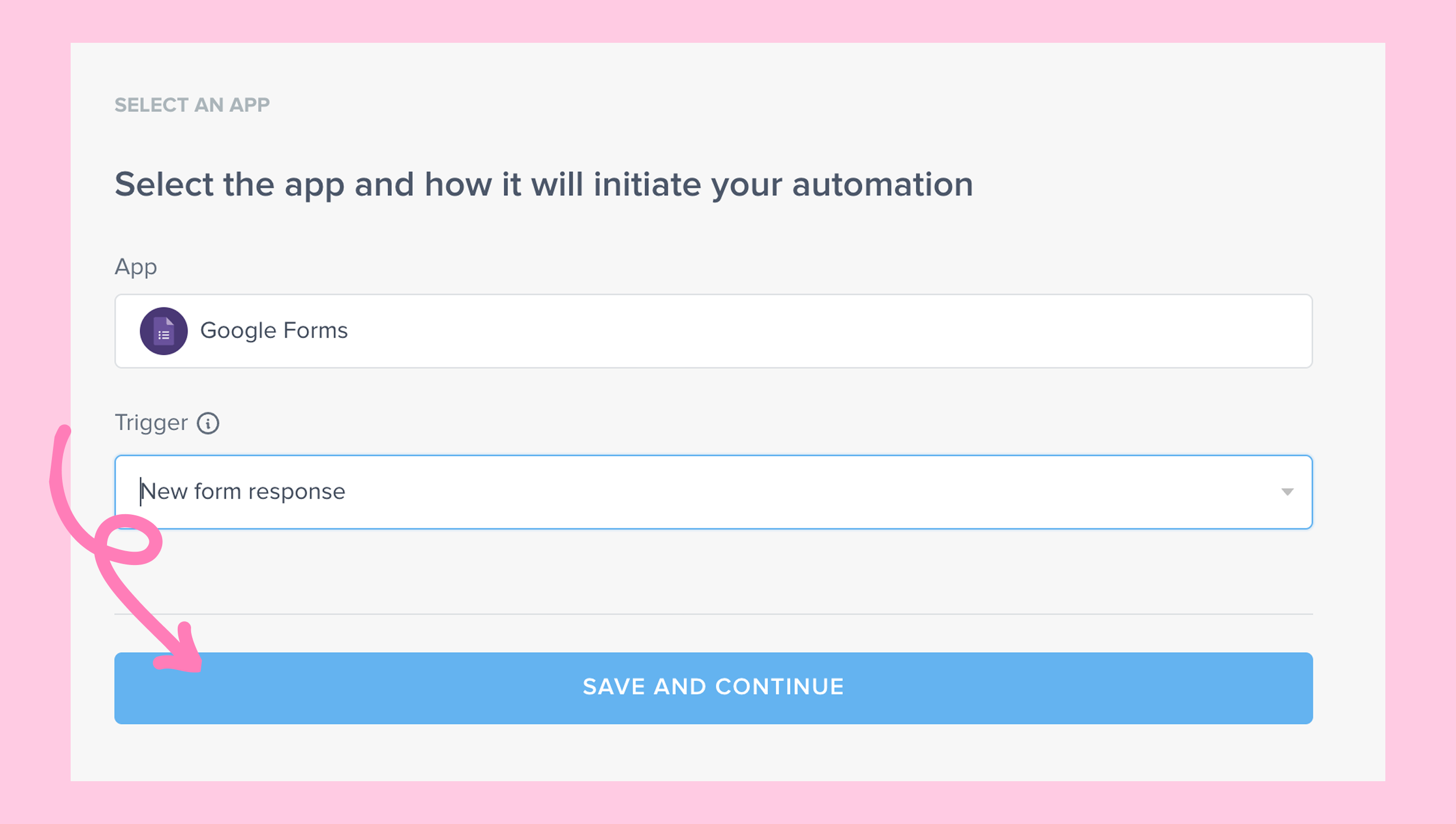 Selecciona Google Forms como la aplicación de origen y elige el evento disparador.