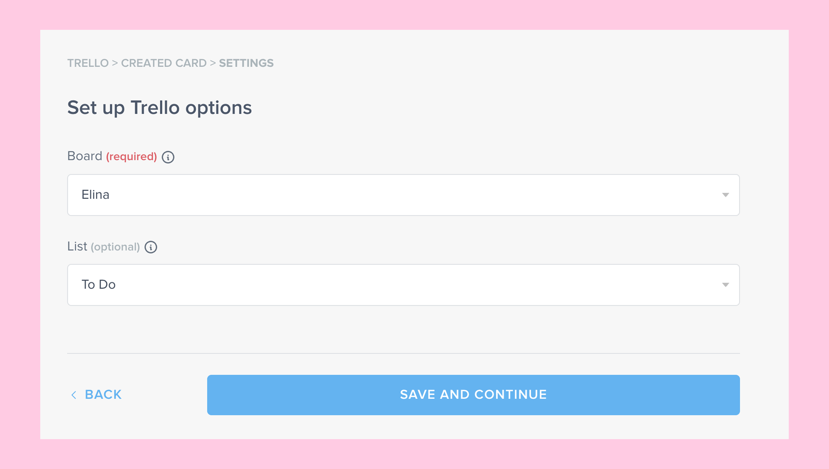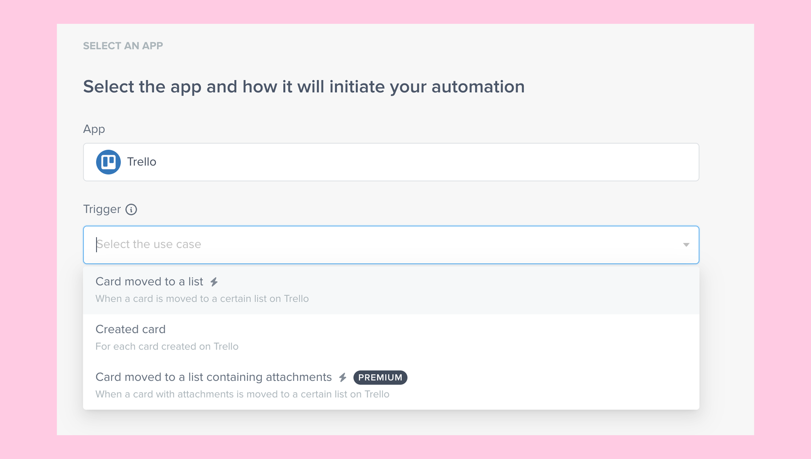 Selecciona Trello como la aplicación de origen y elige el evento desencadenante.