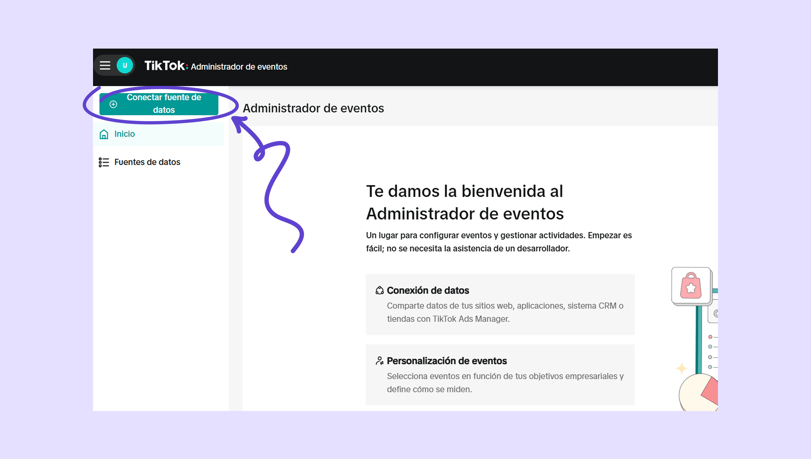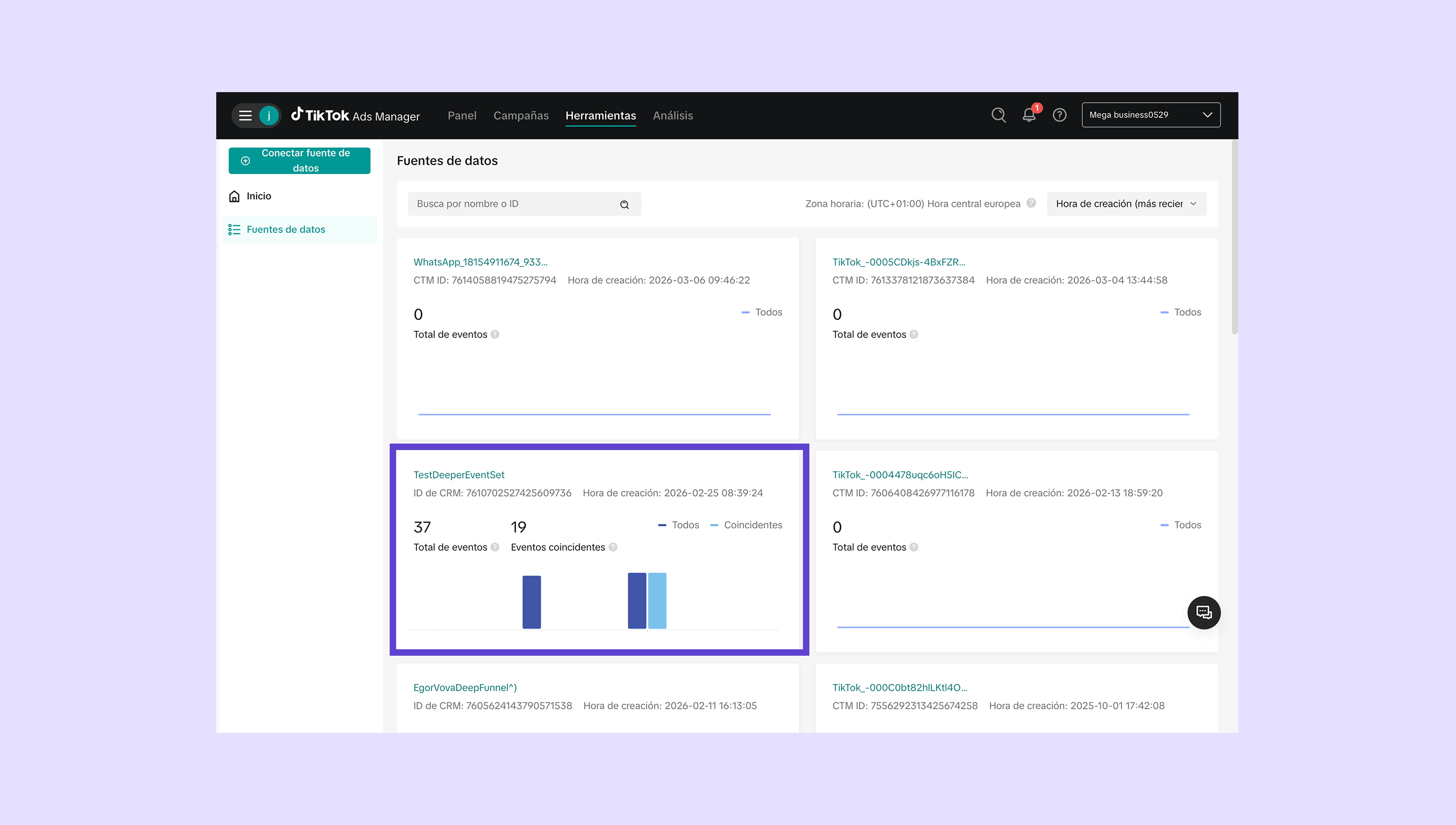 Ve a TikTok Ads → Herramientas → Administrador de eventos → Fuentes de datos . Los eventos enviados a partir de este lead aparecerán en esta página.