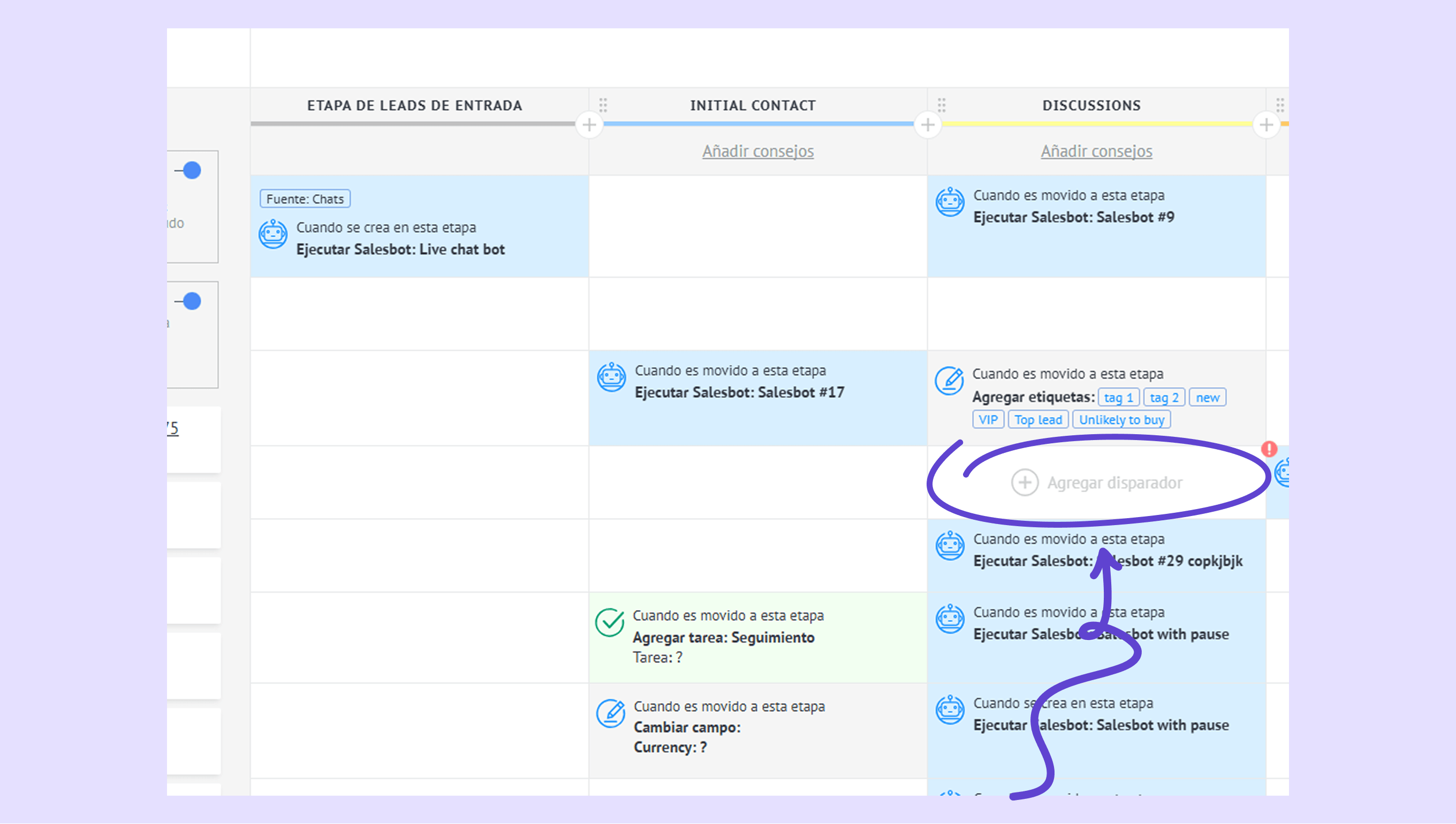 Haz clic en + Agregar disparador en una etapa del pipeline.