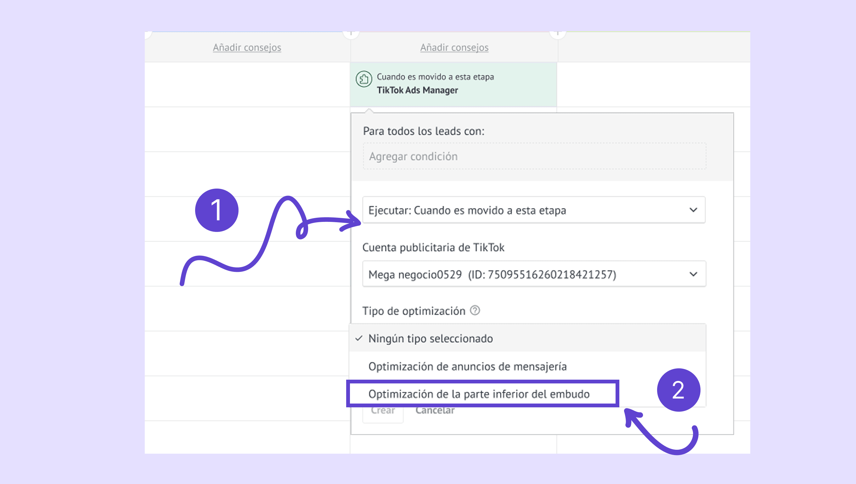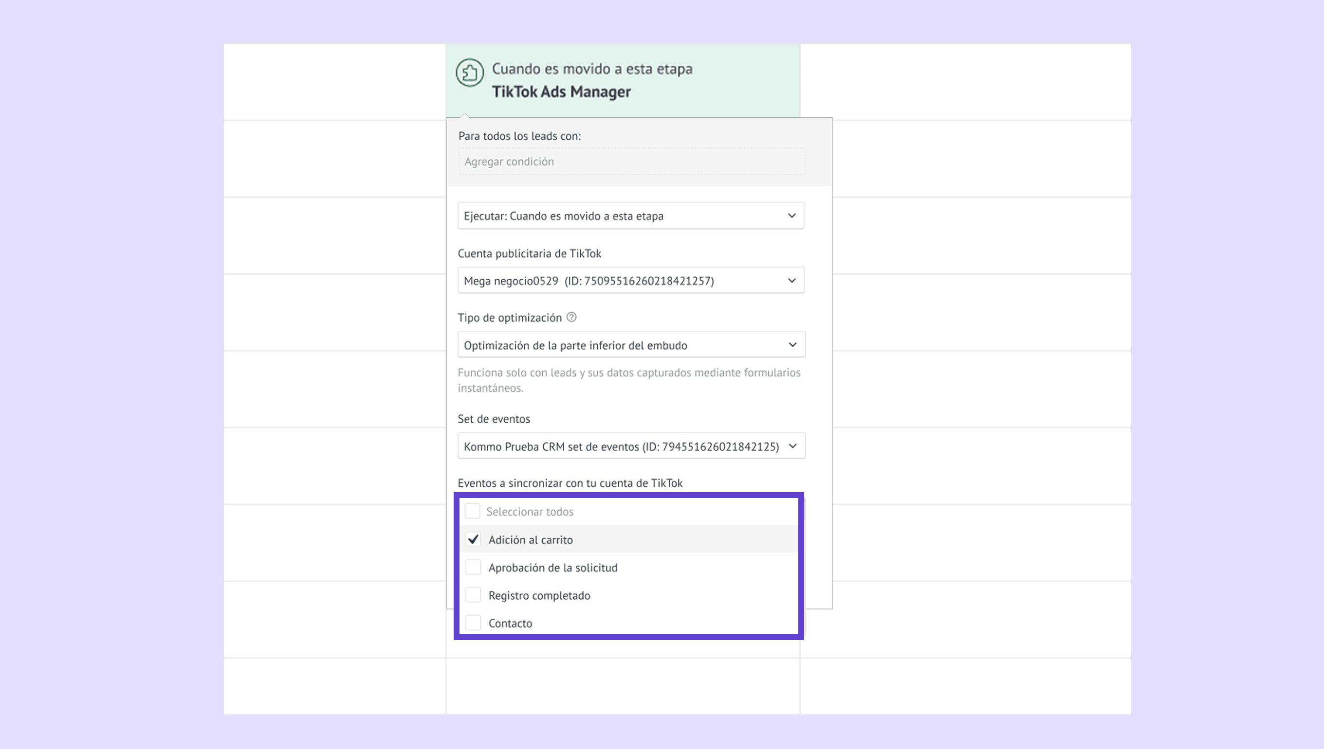 Mueve un lead captado desde los formularios instantáneos de TikTok a la etapa del pipeline donde está configurado el disparador de la optimización de la parte inferior del embudo . -