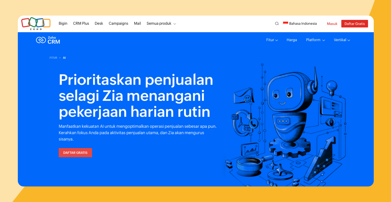 Zoho CRM mengintegrasikan Zia, asisten AI yang menganalisis data dan mengotomatisasi tugas penjualan.